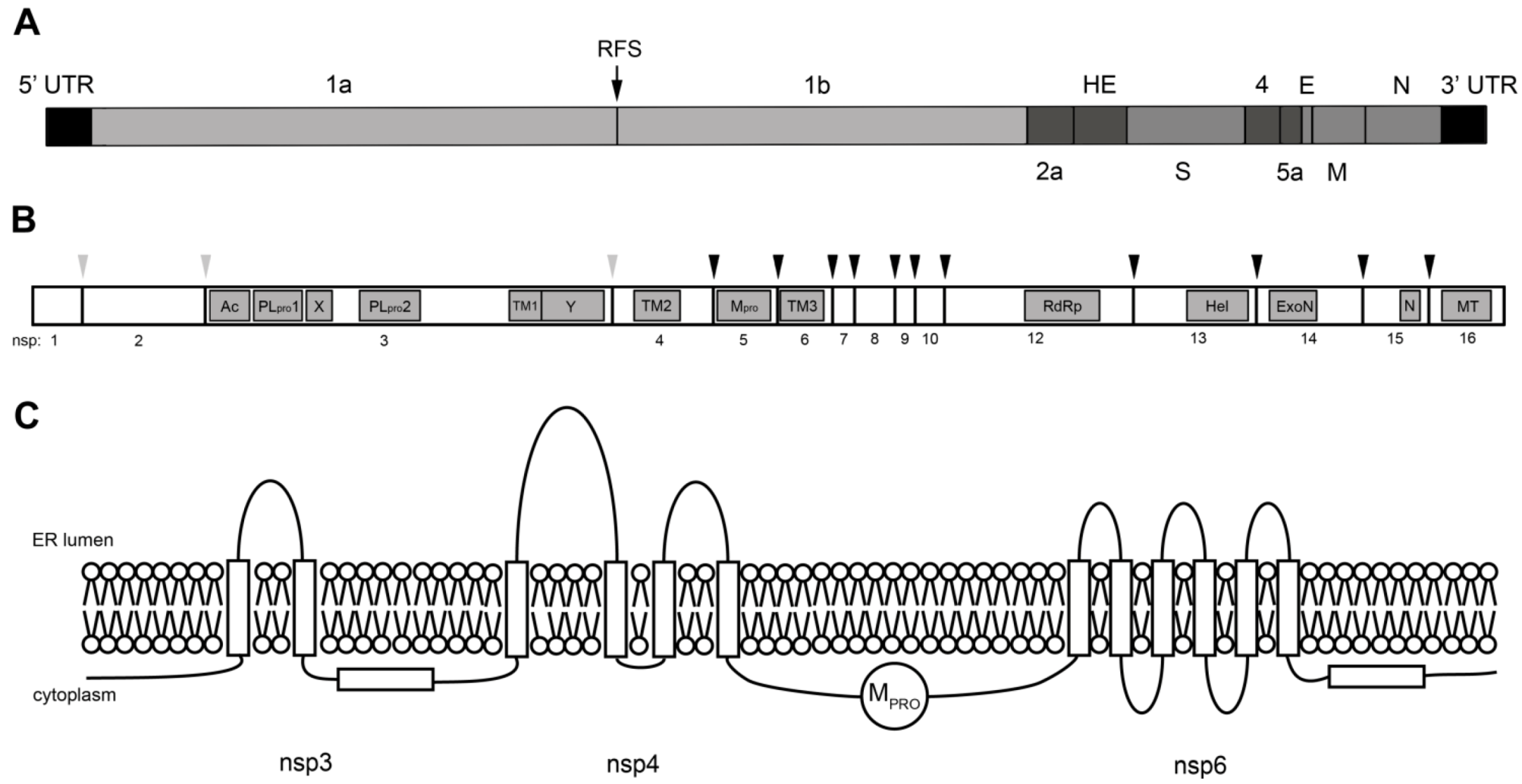 - Kanjanahaluethai, A.; Chen, Z.; Jukneliene, D.; Baker, S.C. Membrane Topology of Murine Coronavirus Replicase Nonstructural Protein 3. Virology 2007, 361, 391–401. [Google Scholar] [CrossRef]