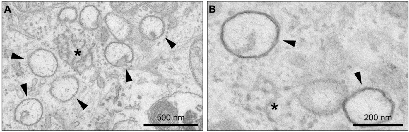 Coronavirus-induced organelle-like replicative structures. (A) Upon coronavirus infection, replicative structures consisting of double-membrane vesicles (DMVs) and convoluted membranes (CMs) are generated; (B) A higher magnification clearly demonstrates that the DMVs contain a double-lipid bilayer. The DMVs are indicated by arrowheads and the CMs by asterisks. The size of the scale bars is indicated.