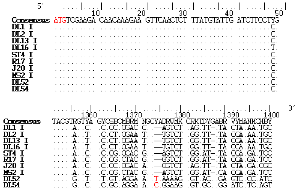 Replicase recombinant region in two JS strains when compared to genogroup I strains (family Leviviridae). Alignment (BioEdit v7.0.1) of the replicase nucleotide sequences from Levivirus genogroup I strains DL1, DL2, DL13, DL16, ST4, R17, J20, MS2 with JS strains DL52 and DL54. For clarity, only a portion of the alignment is shown. Alignment of each genogroup is depicted in discontinuous blocks. The numbers along the top are the nucleotide positions within the replicase gene with the start position of ORF4 assigned as nucleotide 1. Genome sequences read 5'-3' direction. Dots indicate identity with the consensus sequence. Degenerate bases are noted in the standard IUB codes. The replicase start codon and two nucleotide insertions are highlighted in red. Dashes denote a nucleotide sequence deletion from the consensus sequence.