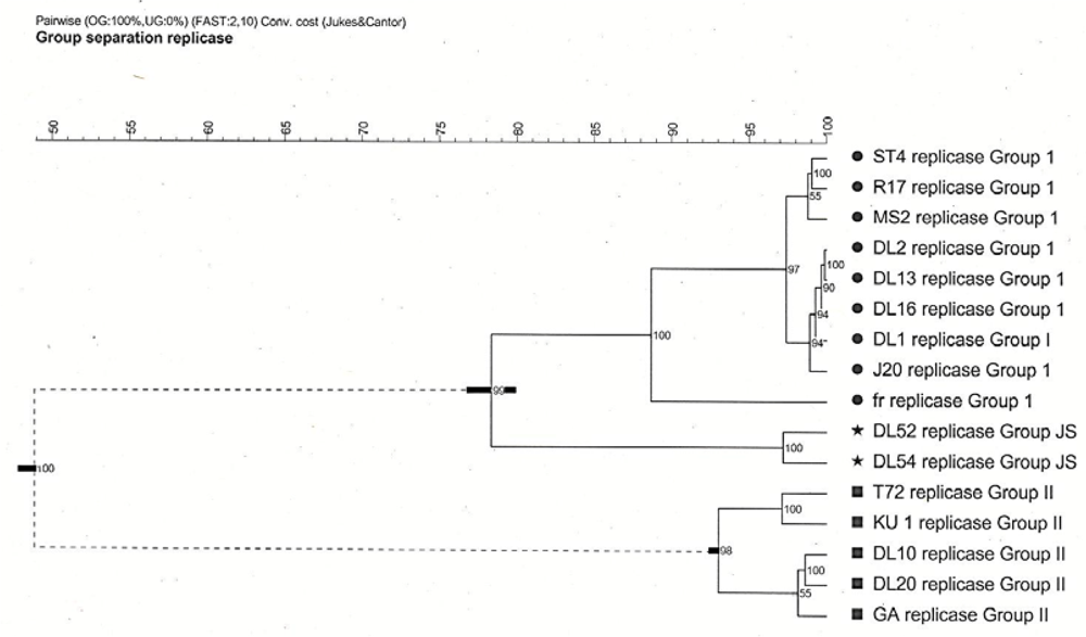 Phylogenetic tree analysis produced a cophenetic correlation which showed (i) ten genogroup I strains, including strain fr, (ii) the JS subgroup strains, and (iii) the genogroup II strains all formed faithful clusters with correlations of 100, 90 and 98, respectively. The cluster cutoff method, however, revealed only two relevant clusters, (i) genogroup I strains, which included fr and JS, and (ii) genogroup II strains. Therefore, the novel JS strains are not a unique Levivirus genogroup. The proposed classification of JS strains is genogroup I subgroup “JS-like”.