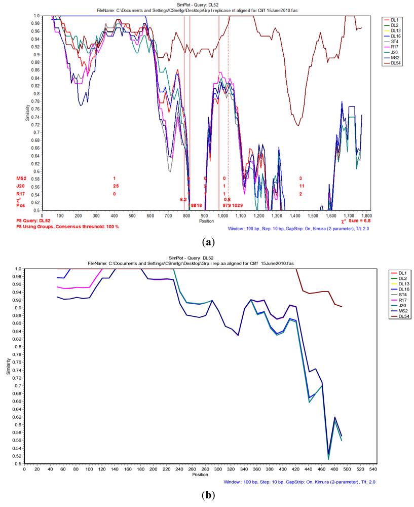When analyzed with RAT, the nucleotide breakpoint (crossover) positions occurred at approximately nt 660 (Figure 4 a) or amino acid 220 (Figure 4 b) within the replicase gene. This crossover occurred when the two recombinant strains, DL52 and DL54, crossed the lines of the other MS-2 like strains and diverged by increasing genetic distances.