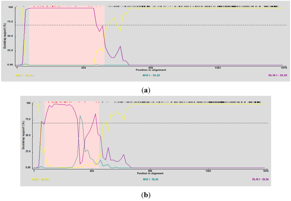 (a) RDP3 analyses prediction of DL52 as a recombinant strain. Recombination area within the replicase gene is shown in pink beginning at nucleotide 84 and crossing over at 592, upstream from the catalytic domain. DL52 was queried to all Levivirus (family Leviviridae) genogroup I FRNA Levivirus strains. RDP3 suggested DL16 as the minor parental strain; (b) RDP3 analyses predicted DL54 as a recombinant strain. Recombination area within the replicase gene is shown in pink beginning at nucleotide 84 and crossing over at 401, upstream from the catalytic domain. RDP3 suggested DL16 as the minor parental strain.
