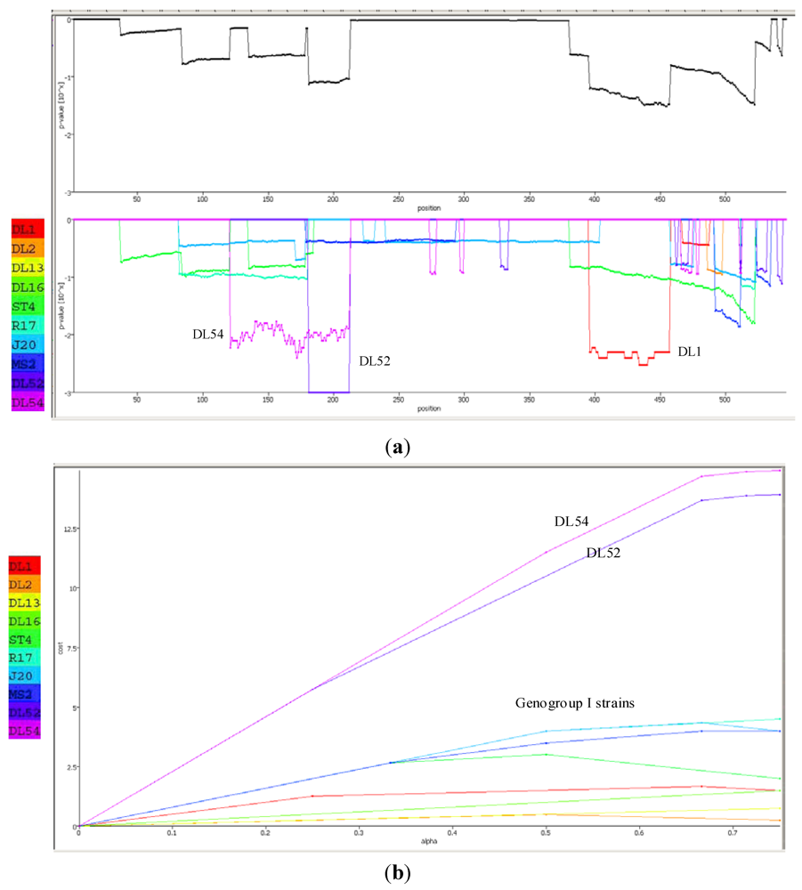 (a) Recco analysis of the RNA-dependent RNA polymerase (replicase) amino acid sequences in Levivirus genogroup I male-specific coliphages (FRNA). Recombination events are displayed by downward peaks in the graphics dataset. The upper graph represents the p-value for recombination at each position along the replicase gene. The lower graph is the breakpoint p-values for the entire set of Levivirus genogroup I and JS strains DL52 and DL54; (b) Recco parametric cost curve analysis of the RNA-dependent RNA polymerase (replicase) amino acid sequences for each FRNA strain in Levivirus genogroup I and JS strains DL52 and DL54. The y-axis corresponds to the cost curve and the x-axis represents α (0–1).