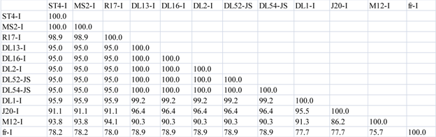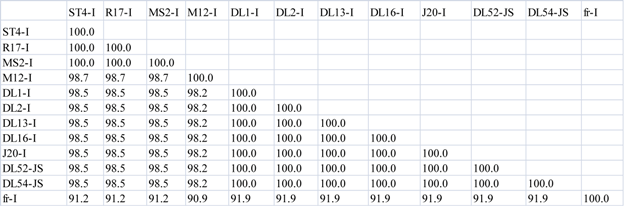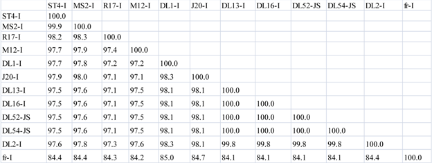 Nucleotide pairwise comparisons of full-length genomes were made between all strains within the Levivirus genome, including strains within genogroups I, JS and genogroups II. Within the nine strains of MS2-like genogroup I, full-length nucleotide sequence similarity was 91–99% [3] whereas the two JS strains, DL52 and DL54, shared 96.73% sequence similarity to each other. In comparison, the JS nucleotide sequences were more similar to MS2-like genogroup I (80–85%) than to the genogroup I strain fr (69%) or to genogroup II strains (52–54%) (Table 3 a).