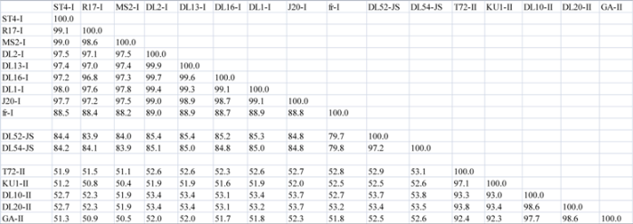 Cophenetic correlations showed the genogroup I strains, the JS subgroup strains, and the genogroup II strains all formed faithful clusters with correlations of 100, 90 and 98, respectively. The cluster cutoff method, however, showed only two relevant clusters being the genogroup I strains, which included fr and JS, and genogroup II strains (Figure 2).