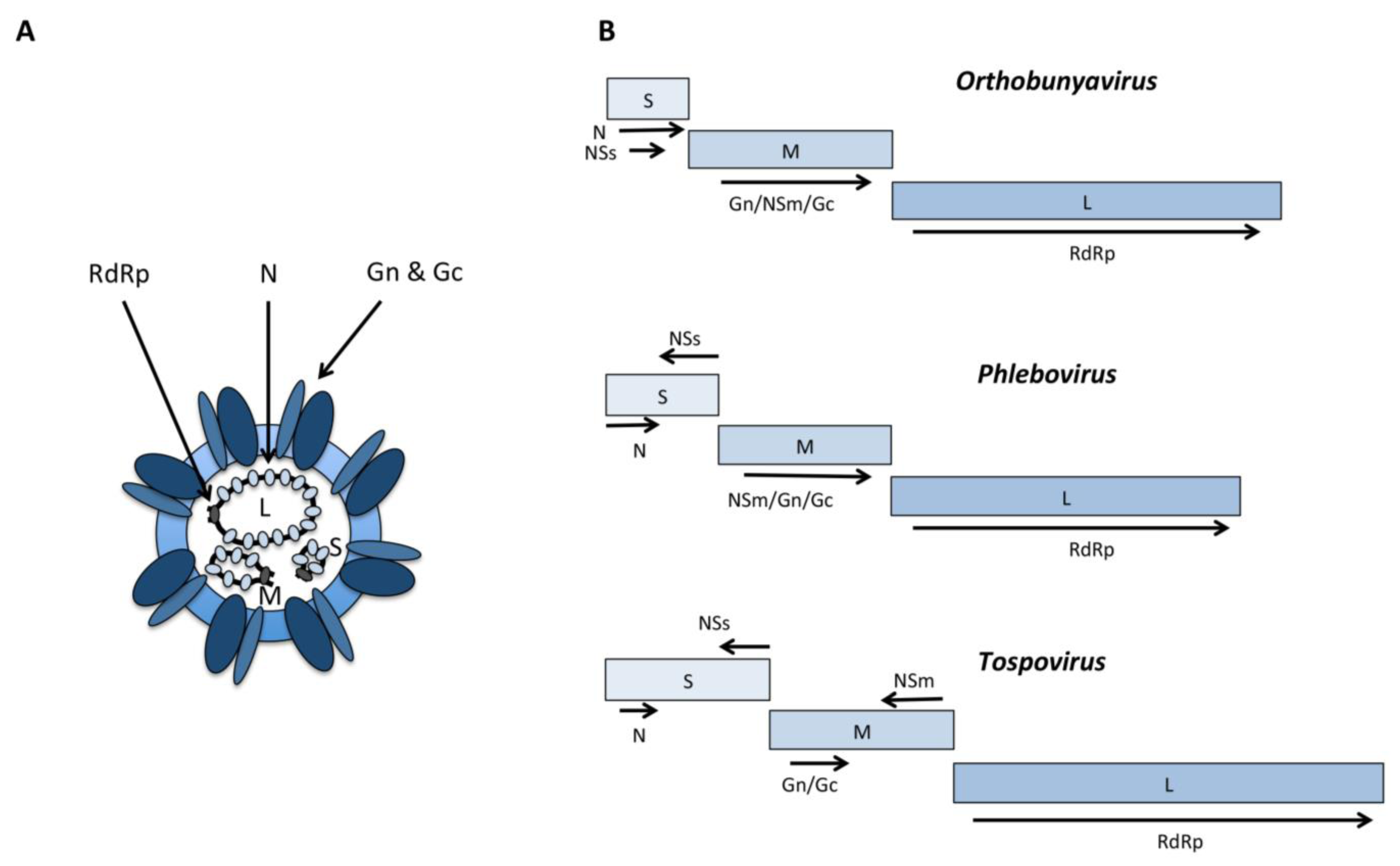 Virion structure and genetic organization of bunyaviruses. (A) The virion containing the three RNA segments (L, M and S) encapsidated by the N protein. (B) Genetic organization of the three bunyavirus genera discussed in the paper. Arrows depict the position of open reading frames (arrows below box, open reading frames in mRNAs transcribed from genome; arrows above box, open reading frames in mRNAs transcribed from antigenome).