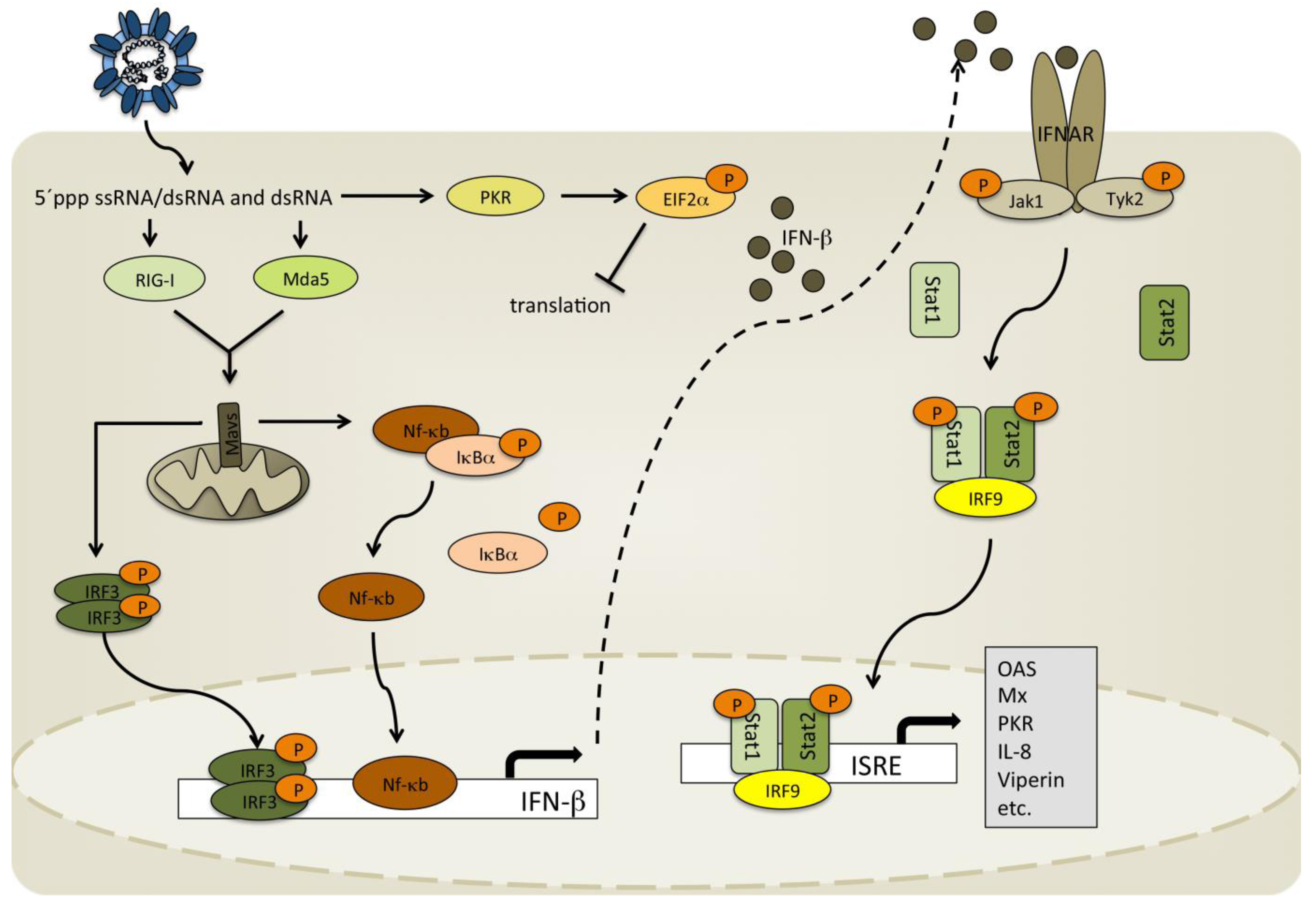 General activation of interferon-β (IFN-β) transcription and induction of IFN-stimulated genes. Biochemical and structural features in the RNA genome or dsRNA produced through viral replication is recognized by RIG-I and Mda5 in the cytoplasm leading to the activation and translocation of IRF-3 and NF-κB into the nucleus where they are involved in initiating the transcription of IFN-β. In addition, 5’-triphosphorylated dsRNA in nucleocapsids triggers the activation of RIG-I and its downstream signaling, as has been shown for Rift Valley fever virus (RVFV) and La Crosse virus (LACV) [45]. The resulting IFN-β is transported out of the cell where it binds to IFN receptors (IFNAR), thereby activating the JAK/STAT pathway leading to the transcription of a number of different IFN stimulated genes that aim to restrict viral replication and spread and initiate an antiviral state in uninfected cells.