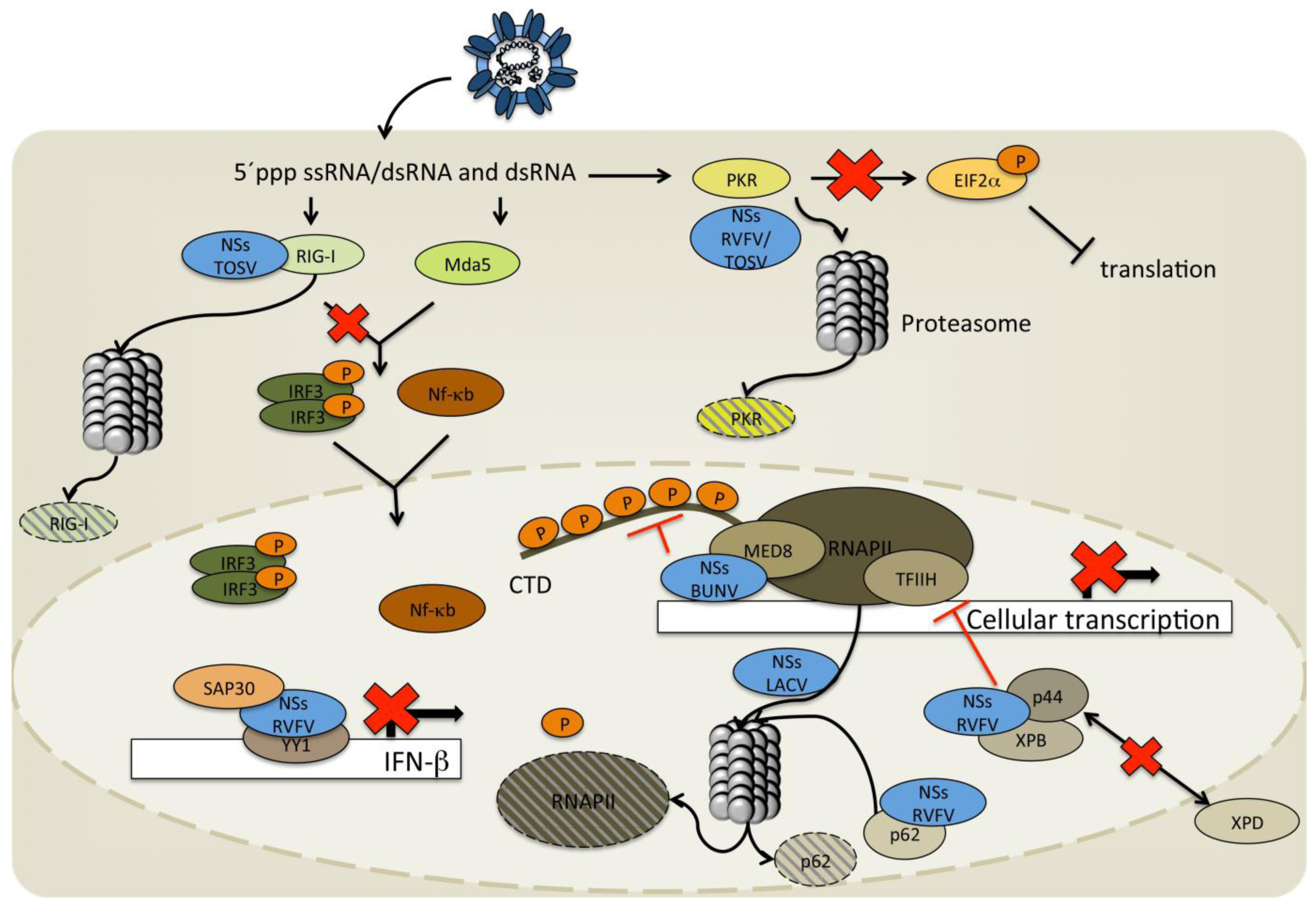 The mechanisms by which NSs of orthobunyaviruses and phleboviruses interfere with the host innate immune system. The NSs proteins of the different bunyaviruses display a variety of different mechanisms to interfere with the host antiviral defense. This is done both by inducing proteasome degradation of proteins such as PKR and RIG-I as well as interfering with the assembly and activation of the transcription machinery inducing a host cell transcription block and inhibiting IFN-β transcription.