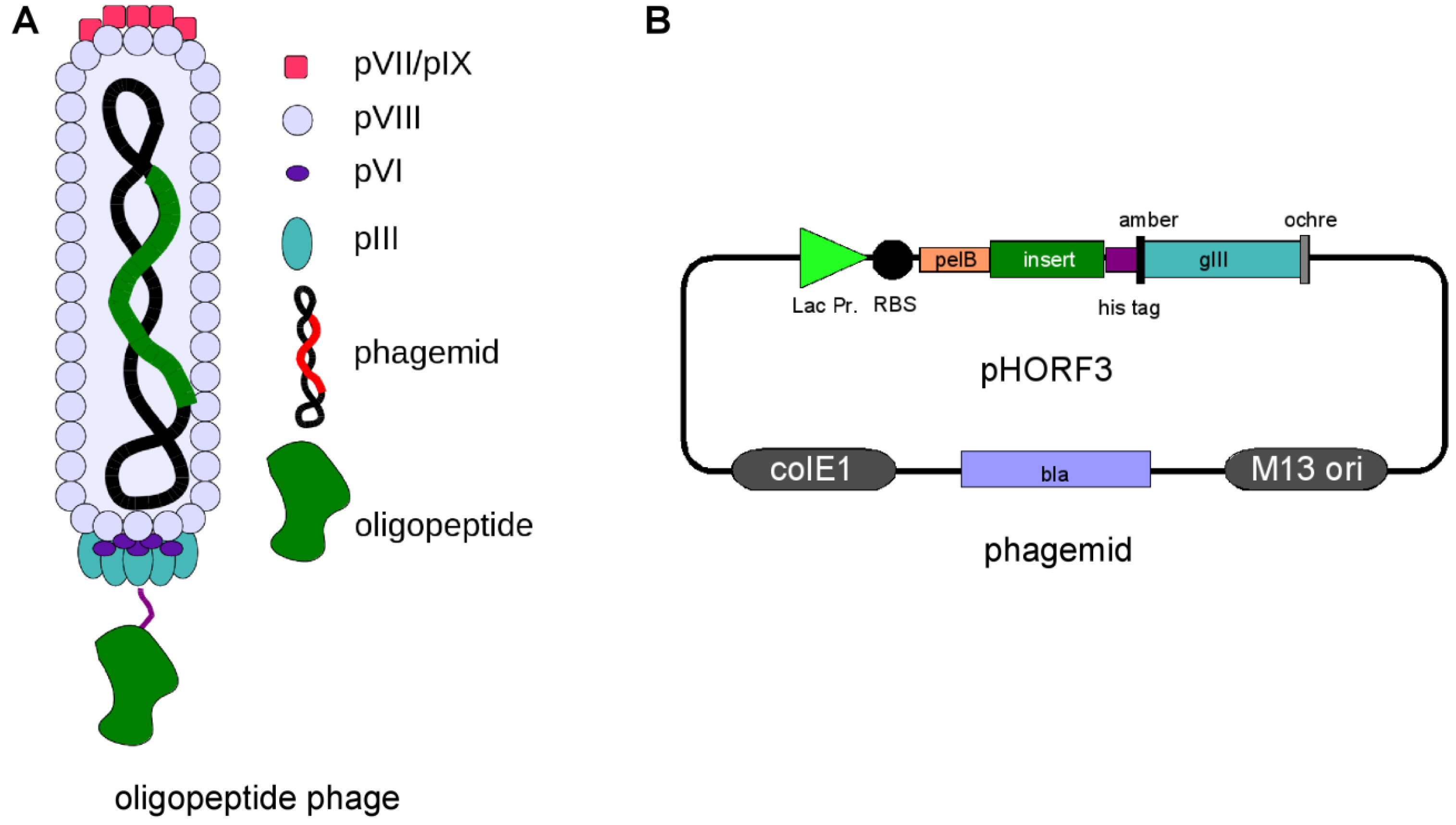 (a). Oligopeptide display on phage. pIII=phage protein III. (b). Schematic overview of pHORF3. Abbreviations: lacZ promoter: promoter of the bacterial lac operon; RBS: ribosome binding site; pelB: signal peptide sequence of bacterial pectate lyase Erwinia caratovora, mediating secretion into the periplasmic space; gIII: gene coding for the phage protein III; amber: amber stop codon; his: six histidine residues; ochre: ochre stop codon. The elements of the inserts are not drawn to scale.
