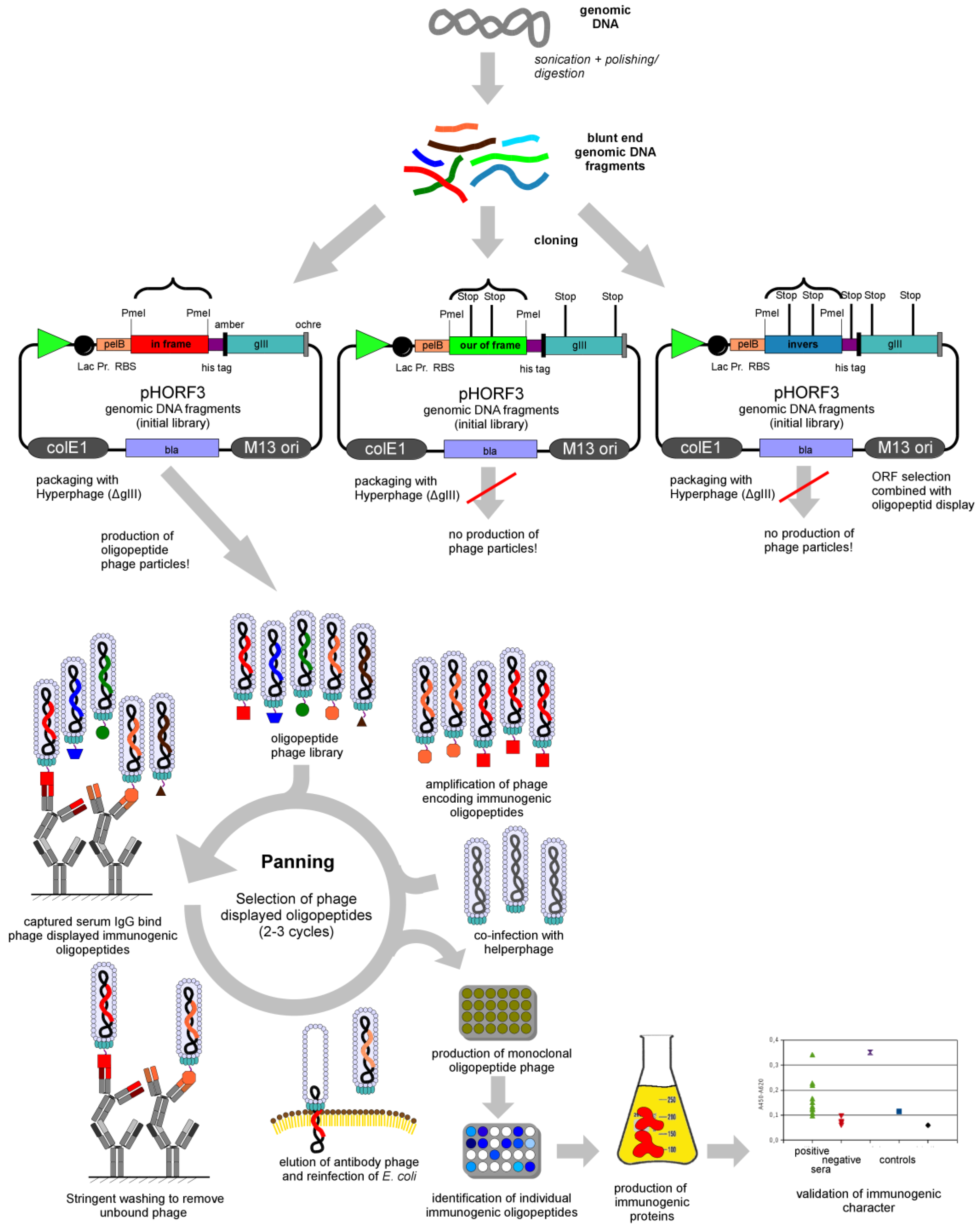 Phage display technology is a widely used method for the selection of peptides, antibodies and alternative scaffolds [1,2,3,4,5,6], whereas oligopeptide phage display for the identification of immunogenic proteins is, to date, not widely spread. The fundamental technology was invented in 1985 by George P. Smith [7] for filamentous M13 phage. Here, genotype and phenotype of oligo-peptides were linked by fusing the corresponding gene fragments to the minor coat protein III gene of the filamentous bacteriophage M13. The resulting peptide::pIII fusion protein is displayed on the surface of phage particles produced in E. coli. The displayed peptides and the corresponding genes can be affinity purified. From the huge diversity of a library, single binding partners are selected under defined selection conditions [8,9,10]. Several phage display systems utilizing insertion of peptide, oligopeptide and antibody genes into the phage genome have been developed, e.g. for phage T7 [11,12,13], phage Lambda [14,15,16,17] and for filamentous phage (f1, fd, M13) [7]. The most commonly phage display systems used for oligopeptide are the bacteriophage lambda [14,18,19,20] and filamentous phage M13 [21,22,23]. A potential disadvantage of the filamentous M13 phage system is the transport of fusion proteins in an unfolded state into the periplasm using the Sec or SRP pathway. In the periplasm the phage coat protein with its fusion partner is folded and incorporated into the phage particle prior to the release of the phage particle from the host cell [24,25]. This can be beneficial for the folding of some proteins, e.g. secreted heterelogous proteins, but also deleterious for other proteins, e.g. cytoplasmic proteins. In contrast, oligopeptides displayed on the lytic phage lambda do not need to be transported to the periplasm and can fold in the cytoplasm but incorporation of large proteins into phage lambda capsids is limited [26,27]. Additionally, the handling and library storage using the lytic lambda phage is laborious compared to the non-lytic M13 phage. Therefore, it is unlikely that a single phage display system will be compatible with all proteins that could theoretically be displayed [28]. A way for displaying cytoplasmic folded proteins using M13 phage is the use of the Tat pathway for secreting the folded protein of interest. In the periplasm, the protein of interest will be coupled to the phage protein III by using a zipper domain [29]. In this review we will focus on the M13 phage display system but will also give examples for lambda phage display in the field of oligopeptide phage display. As described above, G.P. Smith used the phage protein III as fusion partner, but oligopeptides can be fused to all capsid proteins for presentation on the phage surface. The fusion to the coat protein pIII is widely used and allows the display of even large proteins [30]. A peptide library using pIII as fusion partner is also commercially available from NEB (New England Biolabs) [31]. The main coat protein VIII was used for peptides, oligopeptides and antibody fragments [32,33,34,35], but besides other drawbacks the size of the fusion partner is limited [36]. The coat protein pVI was successfully used in some cases as fusion partner for oligopeptides, mainly from cDNA libraries [37,38,39,40,41]. Alternative fusion partners are pVII and pIX, but these fusion partners on the pIII opposing site were mainly used for antibody fragments [36,42,43,44,45,46]. However, the most commonly used fusion partner for different kinds of peptides, oligopeptides and antibody fragments is pIII [36,47]. The genetic information of the gene of interest was first integrated directly into the phage genome fused to the wild-type pIII gene [7,48], but this resulted in a selection drawback of these phage because of lower infectivity of the pIII fusion and a selective growth advantage of phage with smaller genomes. Therefore, display vectors, termed phagemids, have been developed that uncouple peptide expression from phage propagation by providing the gene encoding pIII fusion protein on a separate plasmid, first shown for antibody fragments [49,50,51,52]. The phagemid contains a M13 phage origin of replication for packaging of the vector into phage particle during assembly. The gene of interest replication and expression are uncoupled from the phage replication cycle, leading to a simplification of library amplification. For the production of phage particles a helper phage is needed that provides all additional components for phage replication and packaging. The helper phage genome bears a mutated origin of replication and will be packaged less efficiently into new phage particle [53]. The display of an oligopeptide on phage and the corresponding phagemid (pHORF3) is shown in Figure 1.