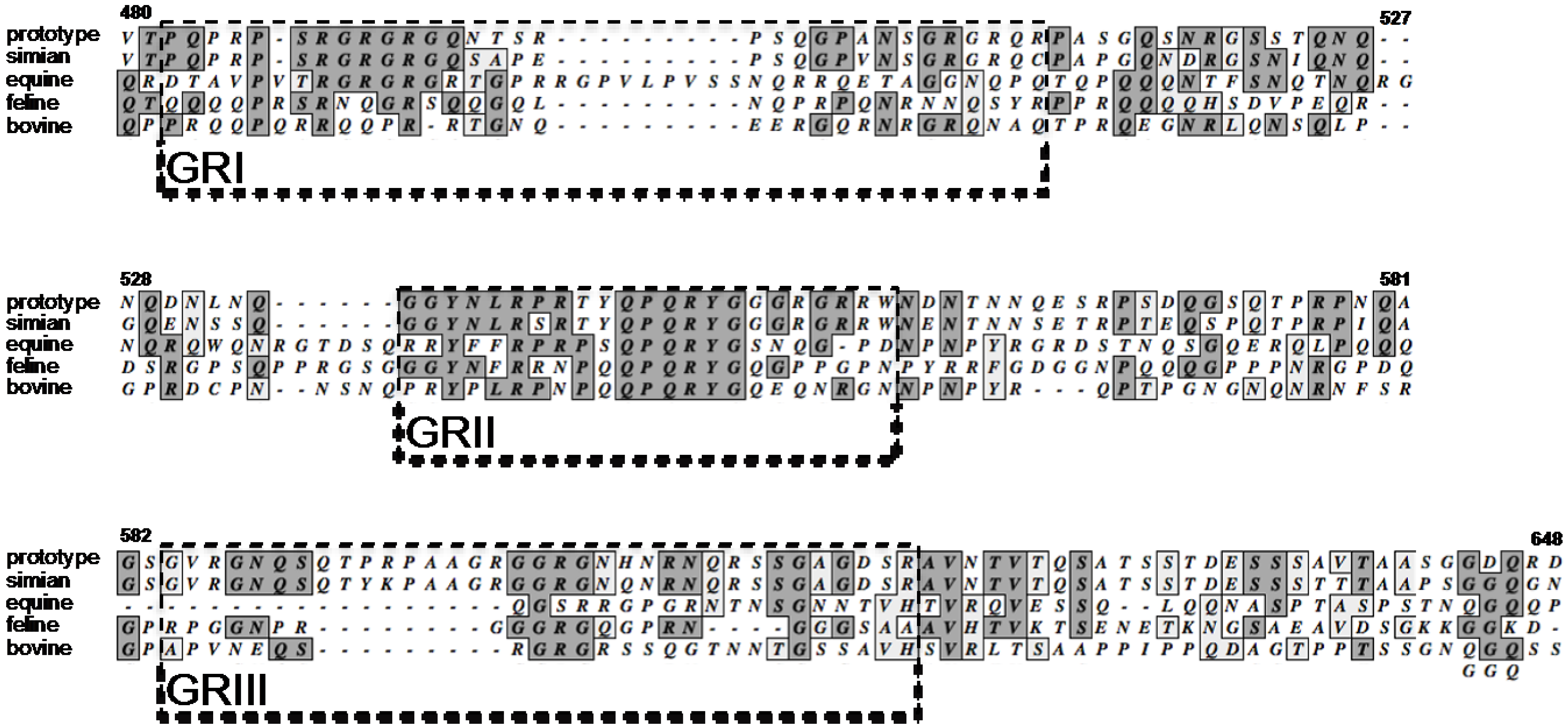 Sequence homology between different retroviral Gag proteins is quite low. In line with that, Gag proteins of different foamyviral isolates have on average of less than 50% amino acid similarity. However, as all retroviral Gag proteins perform similar functions to achieve viral replication, similar functional domains are present in most retroviral Gag proteins (Figure 1).