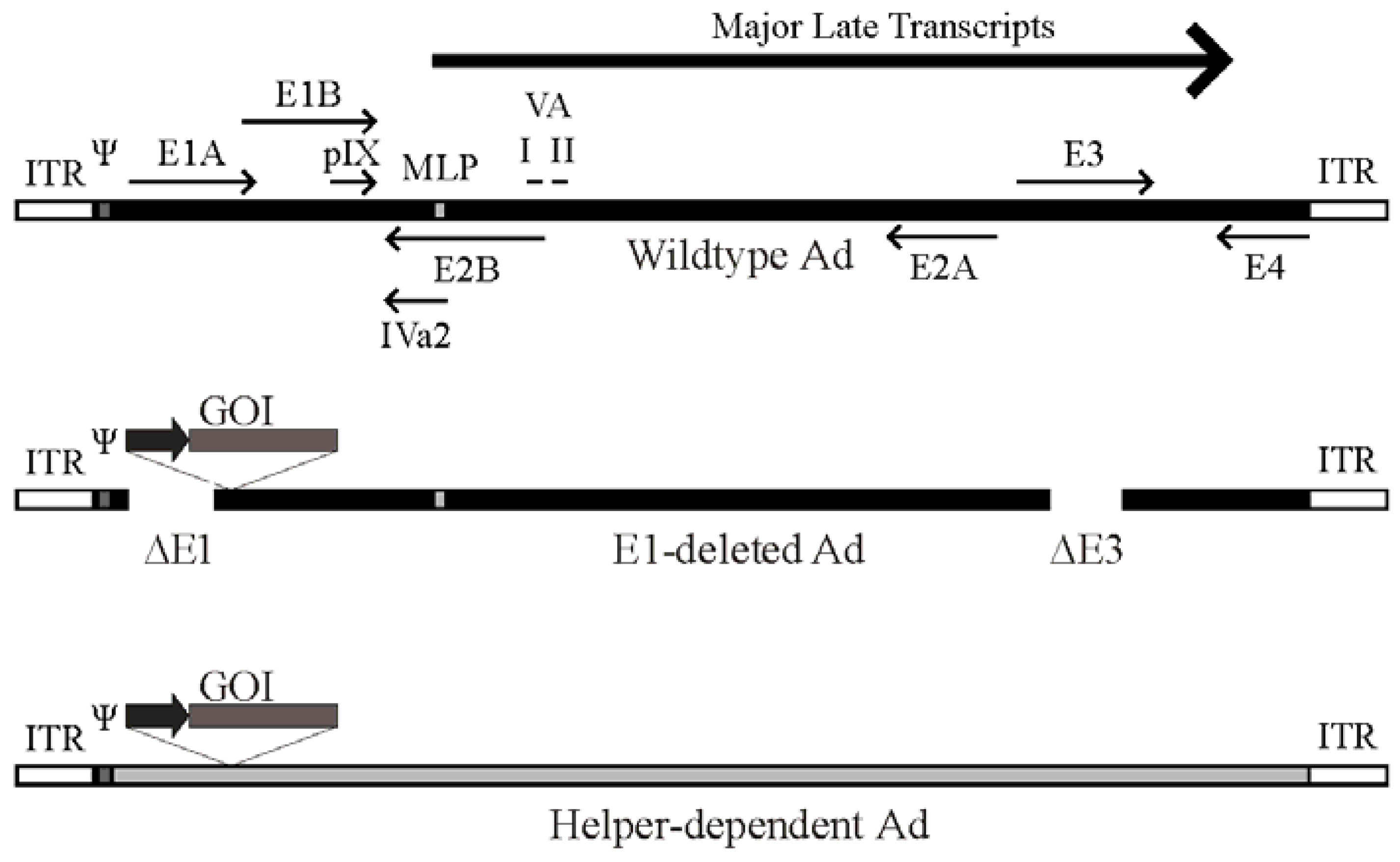 Schematic of the adenovirus genome and adenovirus-based vectors. Top panel: A simplified map of the adenovirus (Ad) serotype 5 genome showing the early genes (E1–E4) and the region from which the major late transcript is produced (the L1-L5 transcripts produced from alternative splicing of the major late transcript are not shown). The relative position of pIX, VA RNA I and II and IVa2 are indicated. Also shown are the viral inverted terminal repeats (ITR) located at each end of the genome, the viral packaging element (Ψ) located adjacent to the left ITR, and the position of the major late promoter (MLP). Please note that these features are not drawn to scale. Middle panel: General structure of an early region 1 (E1)-deleted Ad vector. Most E1-deleted vectors are also deleted of the E3 region, which is not required for replication in tissue culture and increases the cloning capacity to approximately 8 kb of foreign DNA. The gene of interest (GOI) is usually introduced to replace the E1 region and is placed under control by a heterologous promoter (dark arrow). Bottom panel: General structure of a helper-dependent Ad vector. hdAd are devoid of all protein coding sequences, and need contain only the viral inverted terminal repeats and packaging element. hdAd also frequently contain non-coding stuffer DNA (shown in gray) to ensure optimal genome size.