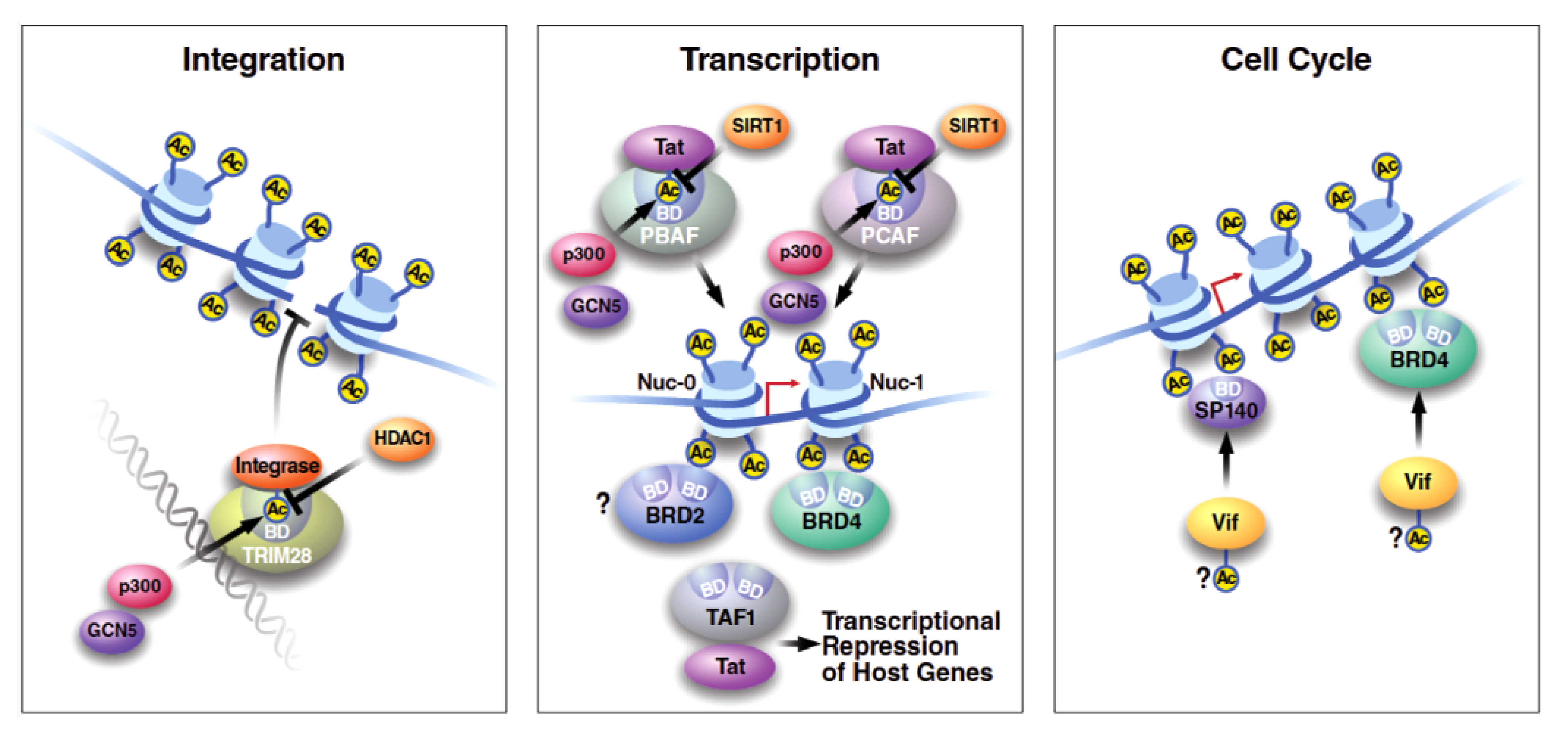 The acetyl-lysine-bromodomain interface, first therapeutically explored in HIV infection, represents an important regulatory axis that controls many aspects of HIV infection, including viral integration, Tat transactivation, HIV latency, cell-cycle progression of infected host cells, and virally induced inflammation. Furthermore, it is likely that new molecular functions for bromodomain-containing proteins in HIV infection await discovery. We expect that the use of existing and the development of novel bromodomain inhibitors will facilitate both the study and the treatment of HIV infection.