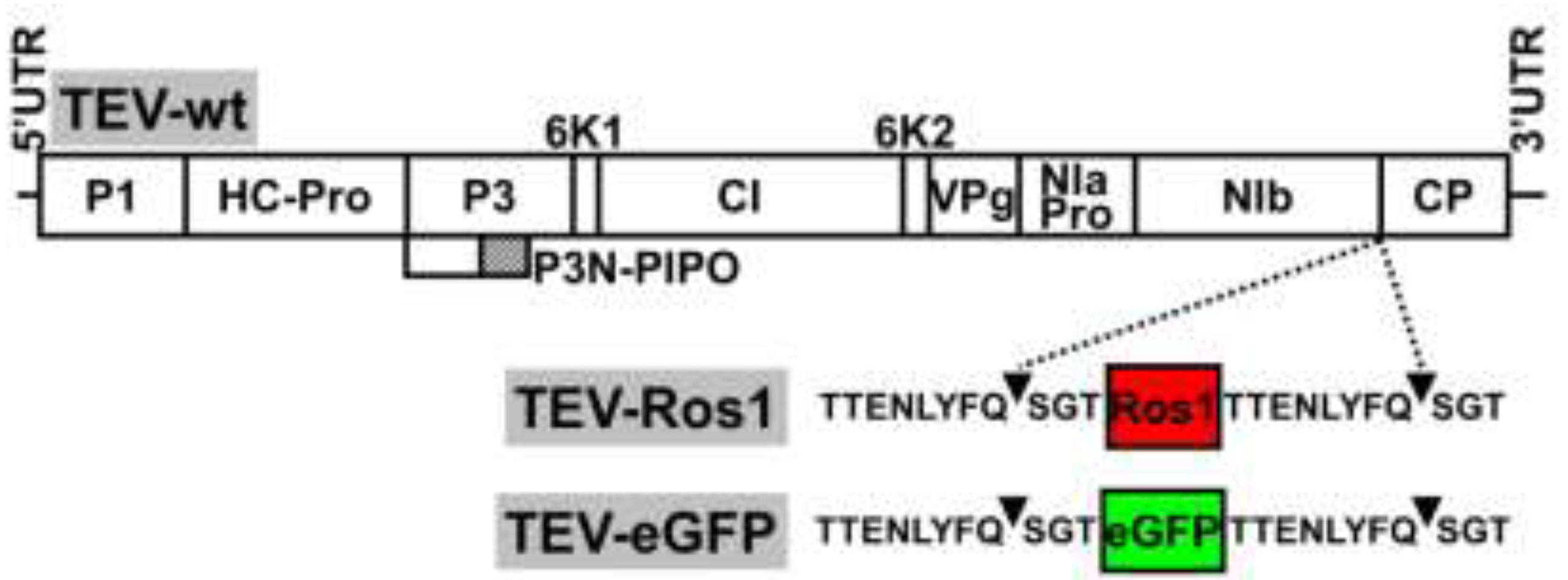 Schemes of wild-type TEV (TEV-wt) and recombinant TEV-Ros1 and TEV-eGFP. Lines represent the viral 5' and 3' untranslated regions (5'UTR and 3'UTR) and boxes represent the viral cistrons P1, HC-Pro, P3, P3N-PIPO, 6K1, CI, 6K2, VPg, NIaPro, NIb and CP, as indicated. The red and green boxes represent Ros1 and eGFP markers as indicated. Sequences of NIaPro cleavage sites flanking the markers in TEV-Ros1 and TEV-eGFP are given. Arrowheads point the exact cleavage position of the protease.