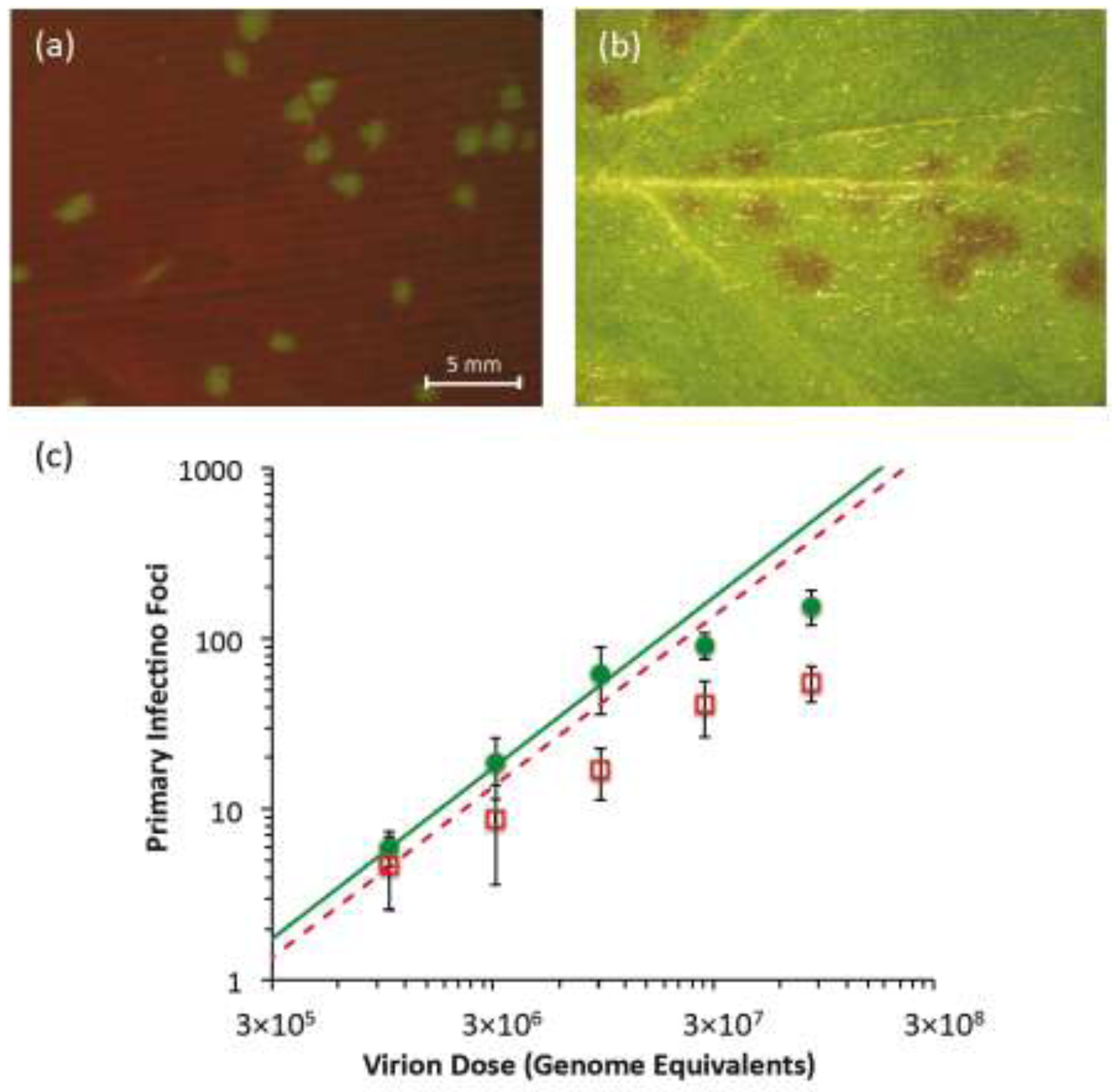 Primary infection foci of TEV-eGFP and TEV-Ros1. In (a), fluorescent stereomicroscope image of primary infection foci of TEV-eGFP at 3 dpi (dose = 3.09 × 106 genome equivalents). In (b), visible stereomicroscope image of primary infection foci of TEV-Ros1 at 6 dpi (dose = 9.26 × 106 genome equivalents). In panel (c), plot of the relationship between dose (abscissae) and the number of foci (ordinate) for TEV-eGFP (green circles) and TEV-Ros1 (red open squares). Error bars denote the standard deviation. To help interpret the data, we used the data from the lowest dose to calculate an infection probability (Section 3.4), and used this value to plot the predicted dose-foci relationship (green line for TEV-eGFP, dotted red line for TEV-Ros1). Note that for the IAH model, the slope of this line is always the same, irrespective of the infection probability.