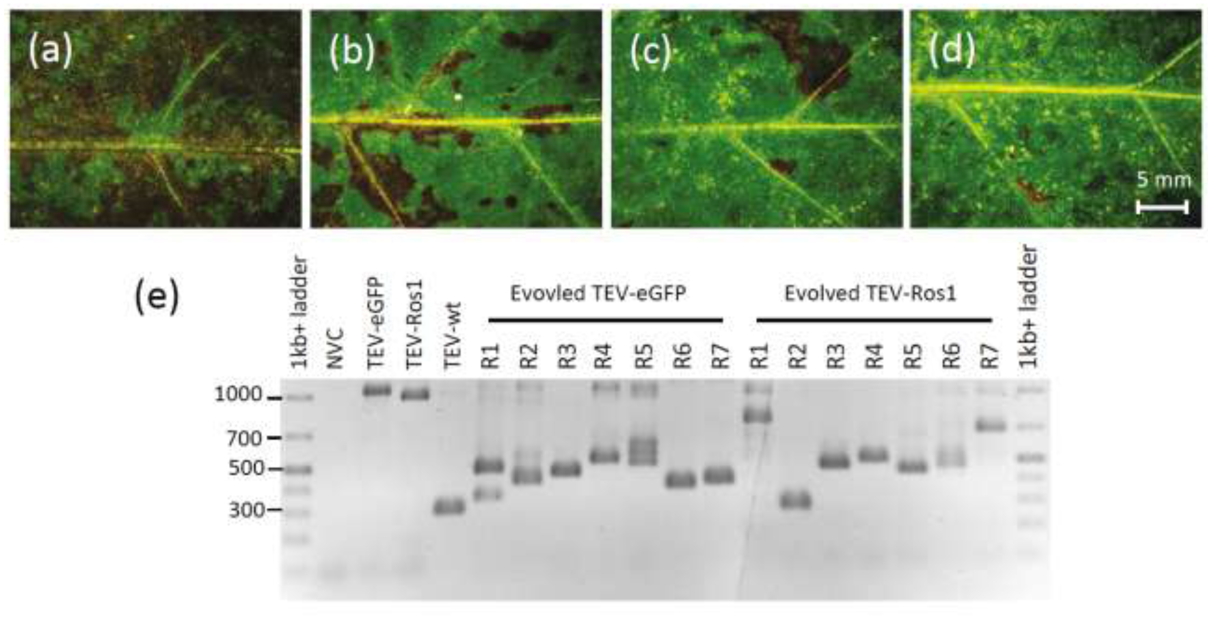. Here t is the time in days, Rt is the virus ratio at the end of the experiment, and R0 is the virus ratio at the start of the experiment. Note that we used a 3:1 mixture of the two viruses in the inoculum, instead of a 1:1 mixture, for methodological reasons. R can only be accurately measured when nmCherry levels are considerably lower (i.e., one-half fold) than nCP levels. We anticipated that the within-host competitive fitness of TEV-Ros1 might be low, and starting with a 3:1 ratio ensures nmCherry levels remain lower than nCP levels.3.6. Analysis of Marker Instability