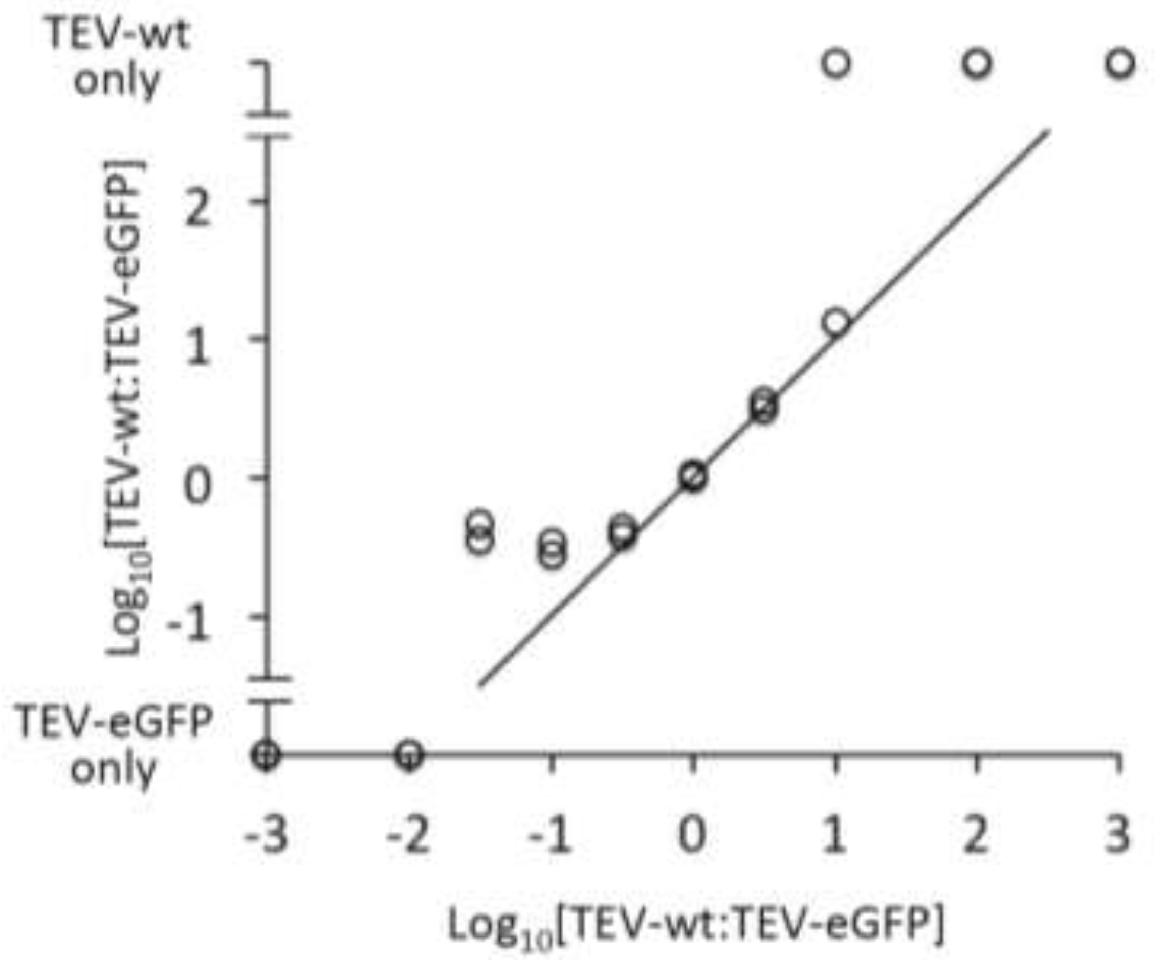 The results of a control experiment to determine whether smaller PCR amplicons were selectively amplified are given. The abscissa is the log10-transformed input ratio, whilst the ordinate is the log10-transformed output ratio. Note that samples containing only TEV-wt or TEV-eGFP are also depicted on the ordinate. Circles represent the data, and the 1:1 relationship between input and output is also given for reference.