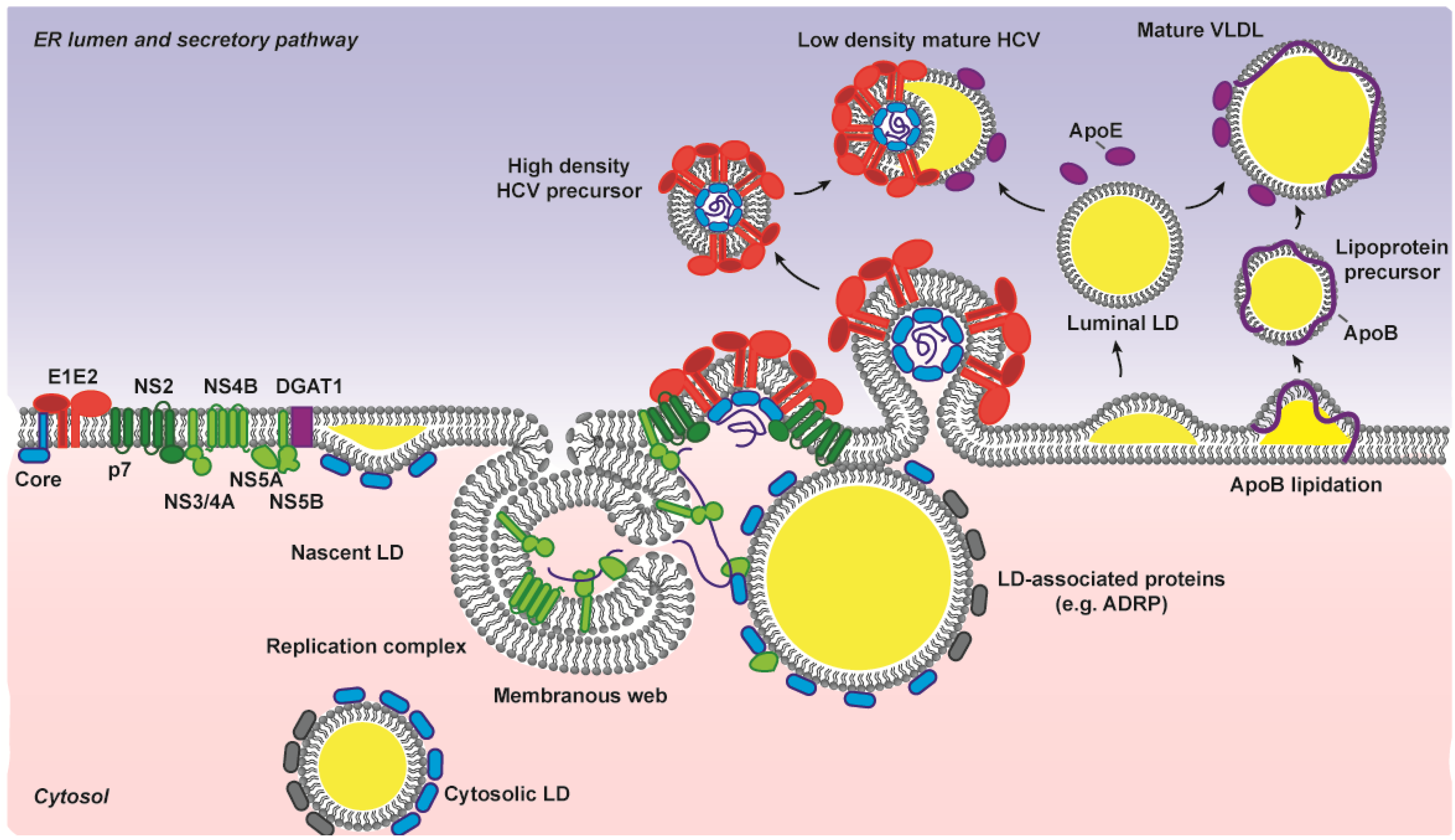 Besides, how and when exactly lipoprotein and HCV syntheses converge to release a lipoviroparticle is unclear. A possible scenario is illustrated in Figure 6 (right side of the figure). Briefly, dense immature intracellular HCV particles [117] might mimic the lipoprotein precursors [173] and undergo a similar maturation process. This maturation may involve the fusion with a luminal LD and concomitant acquisition of the exchangeable apoE [101]. This would result in the release of mixed lipoviroparticles with lower density and larger size [117]. This model is consistent with our recent data indicating that apoE controls a post-envelopment stage of virus production [124]. The use of LDs as a platform for HCV morphogenesis might be sufficient to bring together lipoprotein and HCV assembly factories. Alternatively, specific interaction between HCV proteins and apolipoproteins could help tighten the link at an early stage. One study reported the interaction of E1E2 with serum lipoproteins in vitro [174], and preliminary data from others suggested an interaction between E2 and apoE [175]. ApoAI was shown to bind NS5A [78]. Finally, an interaction between NS5A and apoE has repeatedly been described [119,176,177,178] and might contribute to HCV assembly [176,178]. Given the topology and subcellular localization of the two proteins, it would however be interesting to confirm this interaction in live cells.