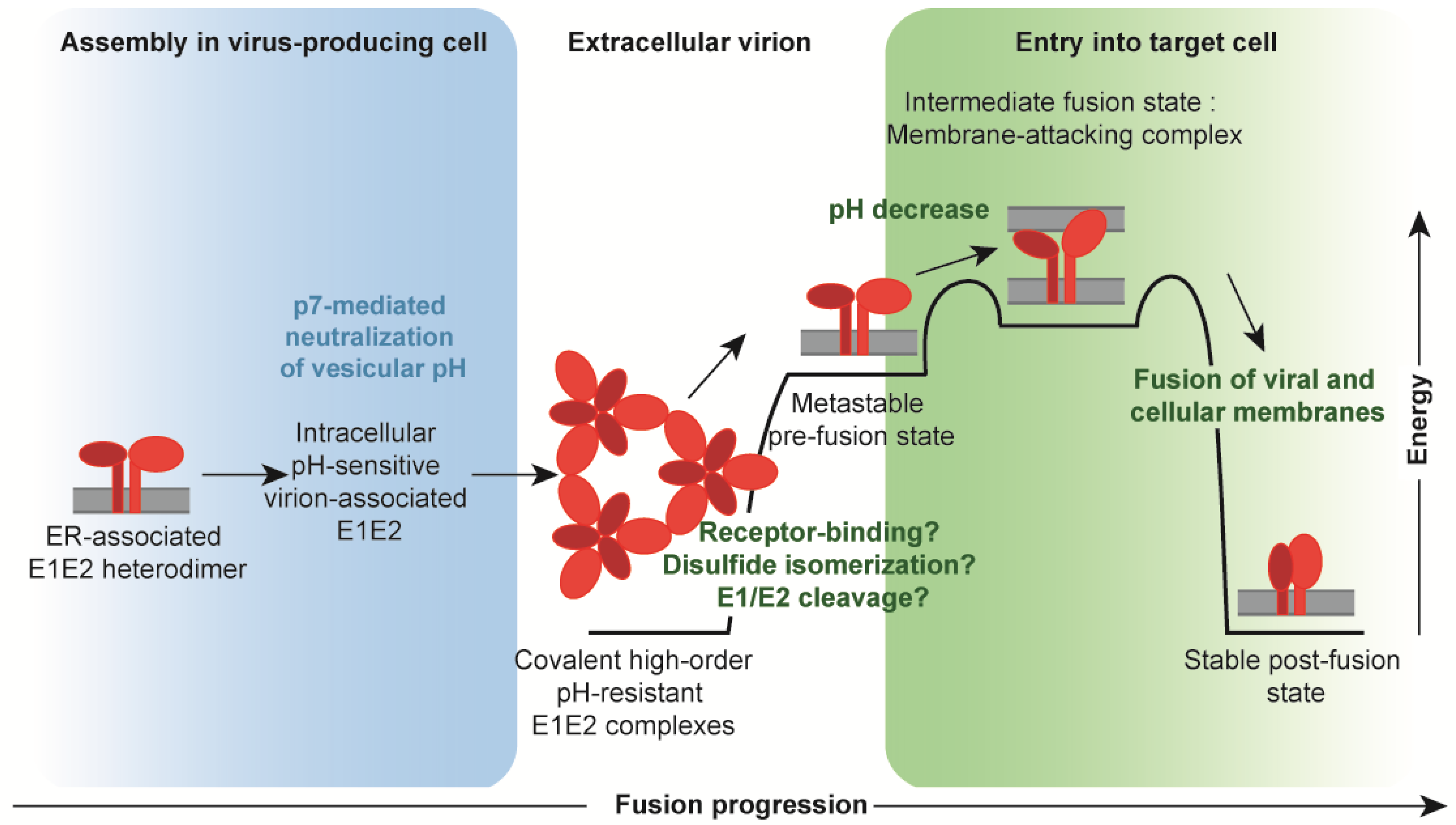 Getting ready for fusion. Hypothetical model of E1E2 rearrangements necessary to mediate viral fusion. Upon virion assembly or release, E1E2 heterodimers reorganize into large covalently bound complexes. At the extracellular virion surface, E1E2 complexes are pH-resistant and need a priming event before they become susceptible to low pH and fusion-competent (CD81 priming [192], possibly other triggers). This could occur concomitantly with a dissociation of the large E1E2 complexes, although a demonstration for this is lacking. In early endosomes, pH acidification will trigger the exposure of the fusion peptide so that viral and host membranes can merge and the fusion protein(s) finally reaches its low-energy post-fusion state. Note that in absence of structural data on E1 and E2 proteins, the identity of the fusion protein was left open on the schema.