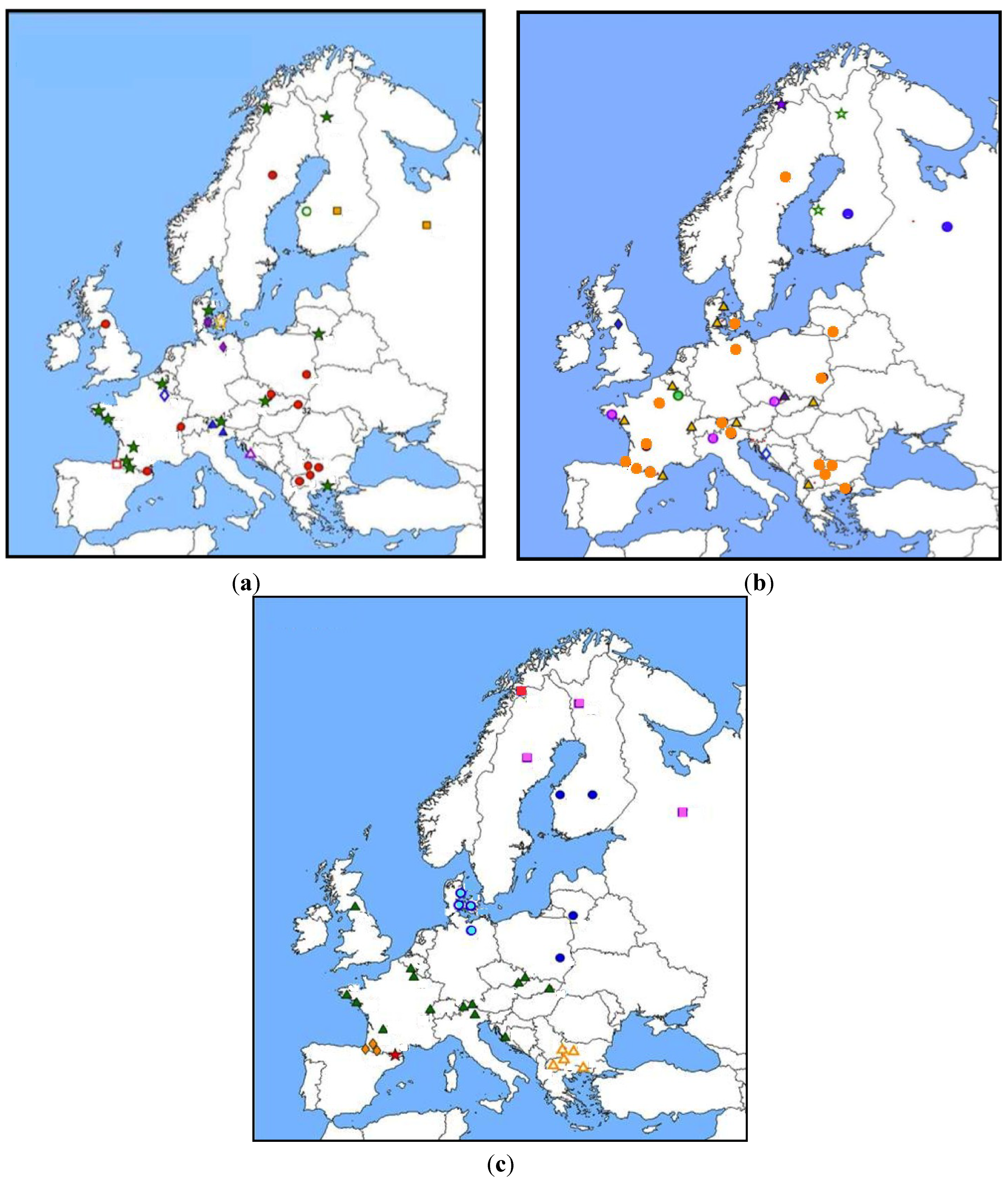 Distribution of Mhc (a) Dqa and (b) Drb exon2; and (c) mitochondrial cytochrome b (cyt b) polymorphism in M. glareolus populations over Europe (from [95,98]). Spatial clustering was defined using Spatial Analysis of MOlecular VAriance (SAMOVA). Populations belonging to a same cluster are represented by a same symbol.