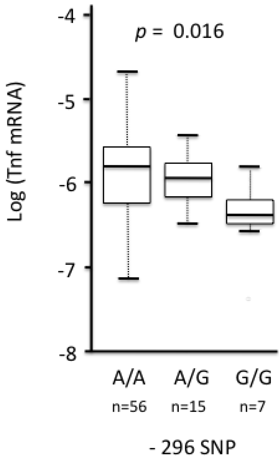 In Europe, polymorphism at site −296 was significantly associated with the relative expression of Tnf gene detected in the spleen [104]. Homozygotes −296 A/A had higher mRNA levels of Tnf gene than the −296 G/G heterozygotes (Figure 2).