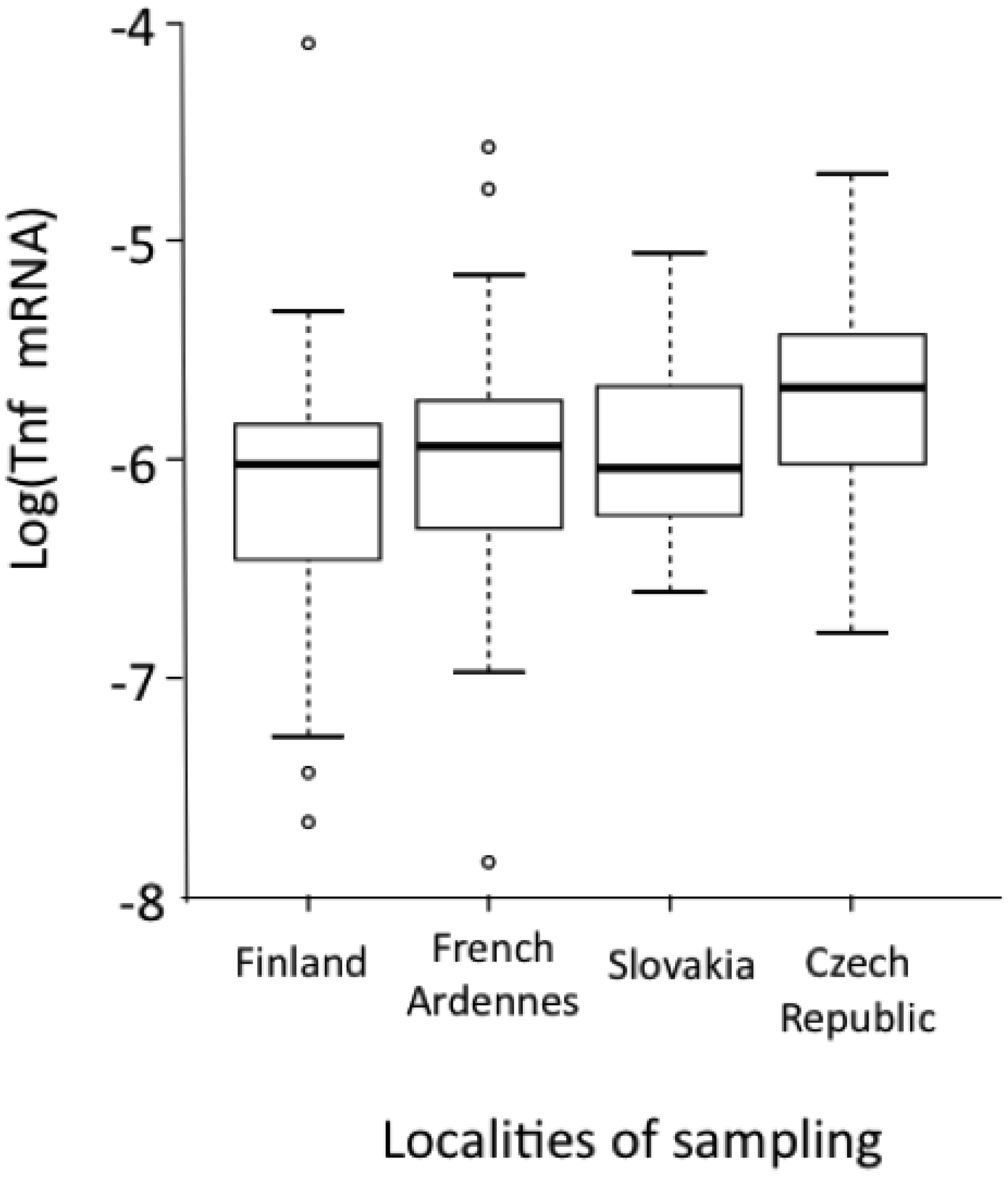 mRNA levels were next compared between localities (Figure 3a). They were significantly lower in bank voles sampled in PUUV endemic areas (Finland, French Ardennes) than in a locality where PUUV has not yet been recorded (Eastern part of Czech Republic). Using the North-South transect in the Ardennes, Guivier et al. [16] also revealed that higher levels of Tnf relative expression were associated with lower PUUV loads in wild bank voles [104].