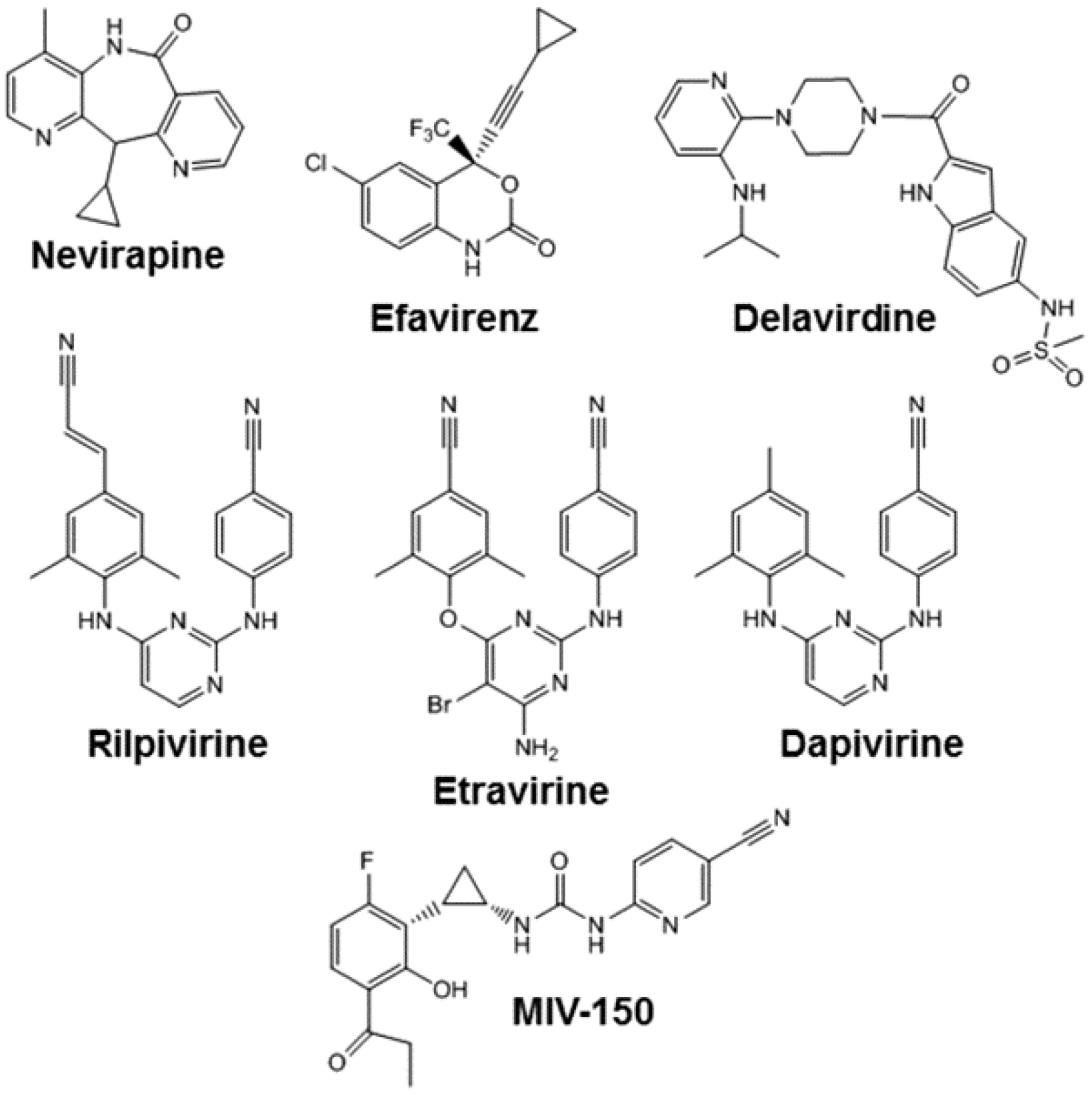 Chemical structures of nonnucleoside reverse transcriptase inhibitors (NNRTIs) used in HIV-1 prevention and treatment strategies.