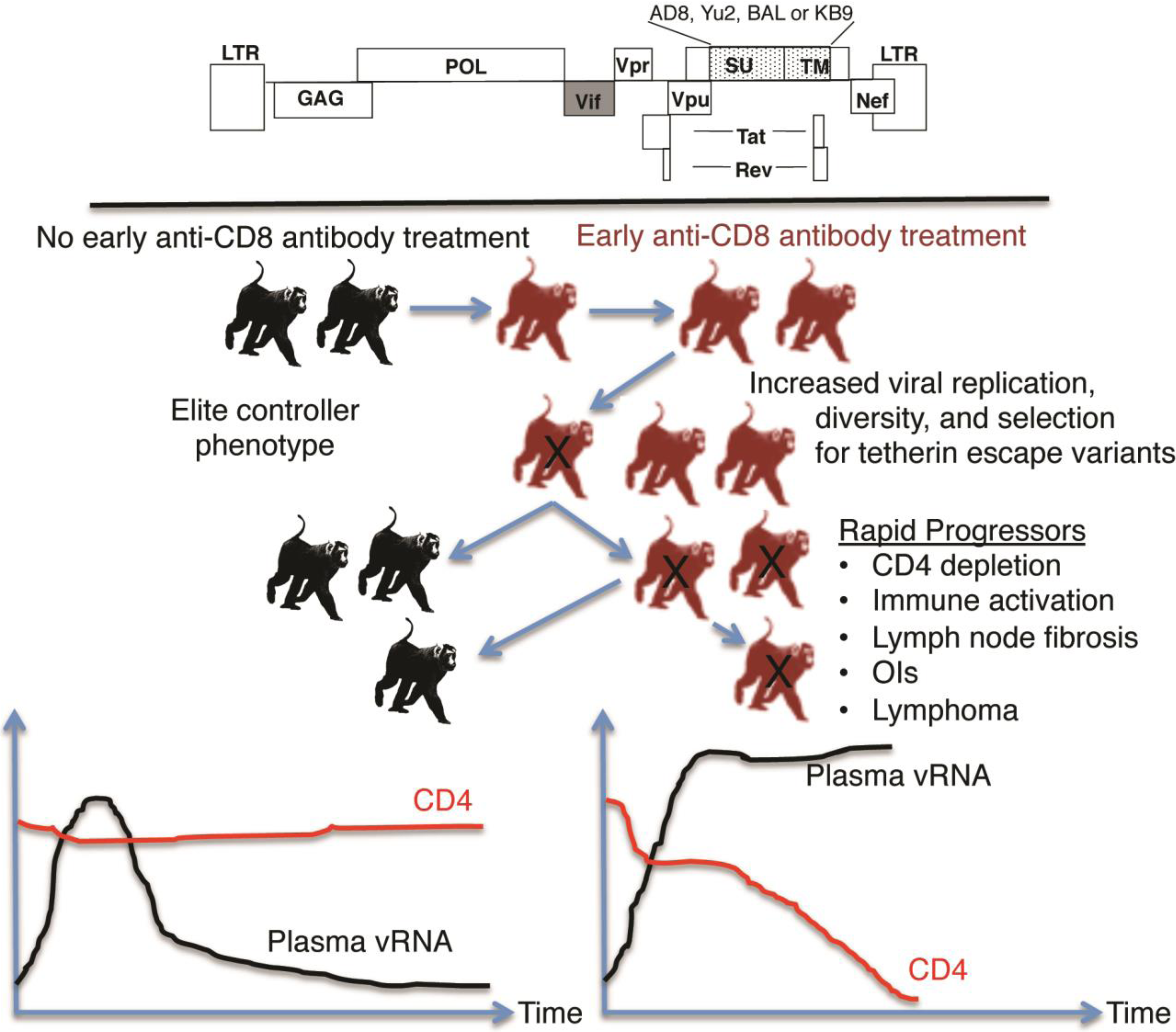 Selection of pathogenic macaque-tropic HIV-1. Pig-tailed macaques were inoculated with a mixture of macaque-tropic HIV-1 clones that contained the env genes of four different CCR5-tropic viruses in a NL4-3 backbone with a SIVmac239 vif replacement. Viruses were inoculated and passaged through pigtails that received anti-CD8 antibody treatment (red) or no treatment (black). Early CD8 cell depletion increased viral replication and emergence of pathogenic macaque-adapted HIV-1. Rapid disease progression (X) depended on CD8 depletion as pigtails that did not receive early anti-CD8 antibody treatment controlled the infecting virus.