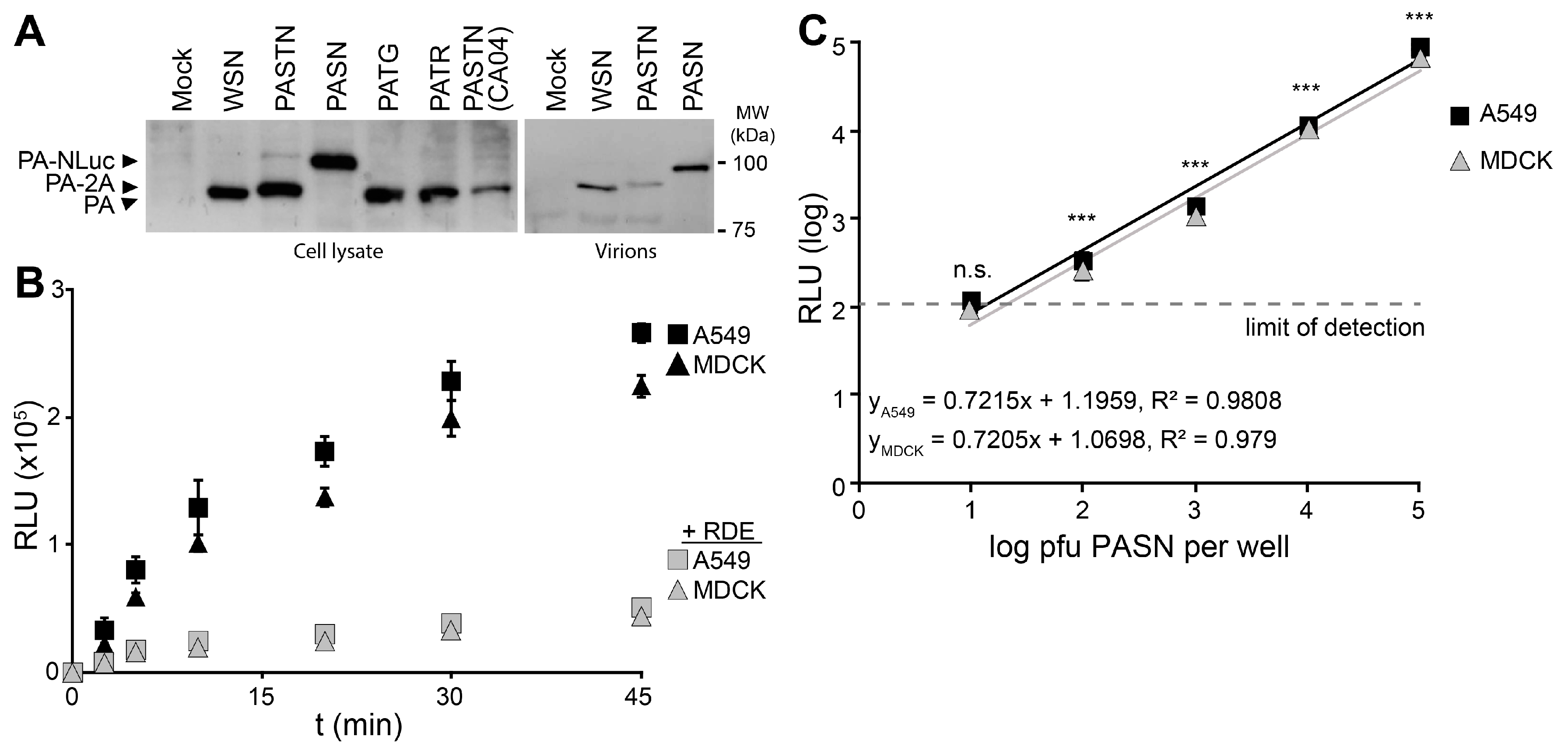 Reporter viruses were used to study early stages in the viral life cycle, beginning with attachment using bioluminescent PASN virions. Hemagglutinin (HA)-mediated attachment to sialic acids on the cell surface is essential during infection and is often disrupted by HA-specific antibodies [21]. Western blotting of PA from infected cells showed that all of the reporter viruses expressed PA at similar level, regardless of the nature of the reporter protein or whether it remained fused to PA (Figure 2A). Blotting of purified virions showed that direct fusion of NLuc to PA resulted in specific packaging of PA-NLuc into PASN virions creating bioluminescent particles, but not the polyprotein of PASTN virions (Figure 2A). To measure the kinetics of virion binding in a high-throughput setting, PASN was incubated with A549 or MDCK cells in a 96-well format (Figure 2B). In parallel, assays were performed on cells pre-treated with neuraminidase to remove sialic acids. At the indicated times, free virions were removed by washing and bound virions were detected by performing a NanoGlo luciferase assay. As the NLuc reporter is packaged within the virion, these assay are designed to measure virion binding to cells, and not infection per se. Binding to A549 and MDCK cells proceeded rapidly and reached a maxima in ~45 min, paralleling prior analyses [22]. Furthermore, neuraminidase treatment reduced binding to background levels indicating that virion binding, and resultant luciferase activity, required sialic acids on the cell surface. To determine the sensitivity of the binding assay, we repeated the experiments with decreasing amounts of virions and allowed binding to proceed to completion (Figure 2C). Our data show a strong linear relationship over 4 logs between input and bound virions. Binding by as few as 100 pfu yielded a reproducible and statistically significant signal above background. This is a highly sensitive readout considering that this assay directly measures virion binding, and does not benefit from the signal amplification that occurs when infections are allowed to proceed to viral gene expression or replication. The entire binding assay was completed in under an hour, demonstrating that bioluminescent PASN particles can be used for the rapid and specific measurement of virion attachment without the need for virus replication. This assay could be easily adapted to measure receptor binding specificity or the ability of neutralizing antibodies or similar therapeutics to block attachment.