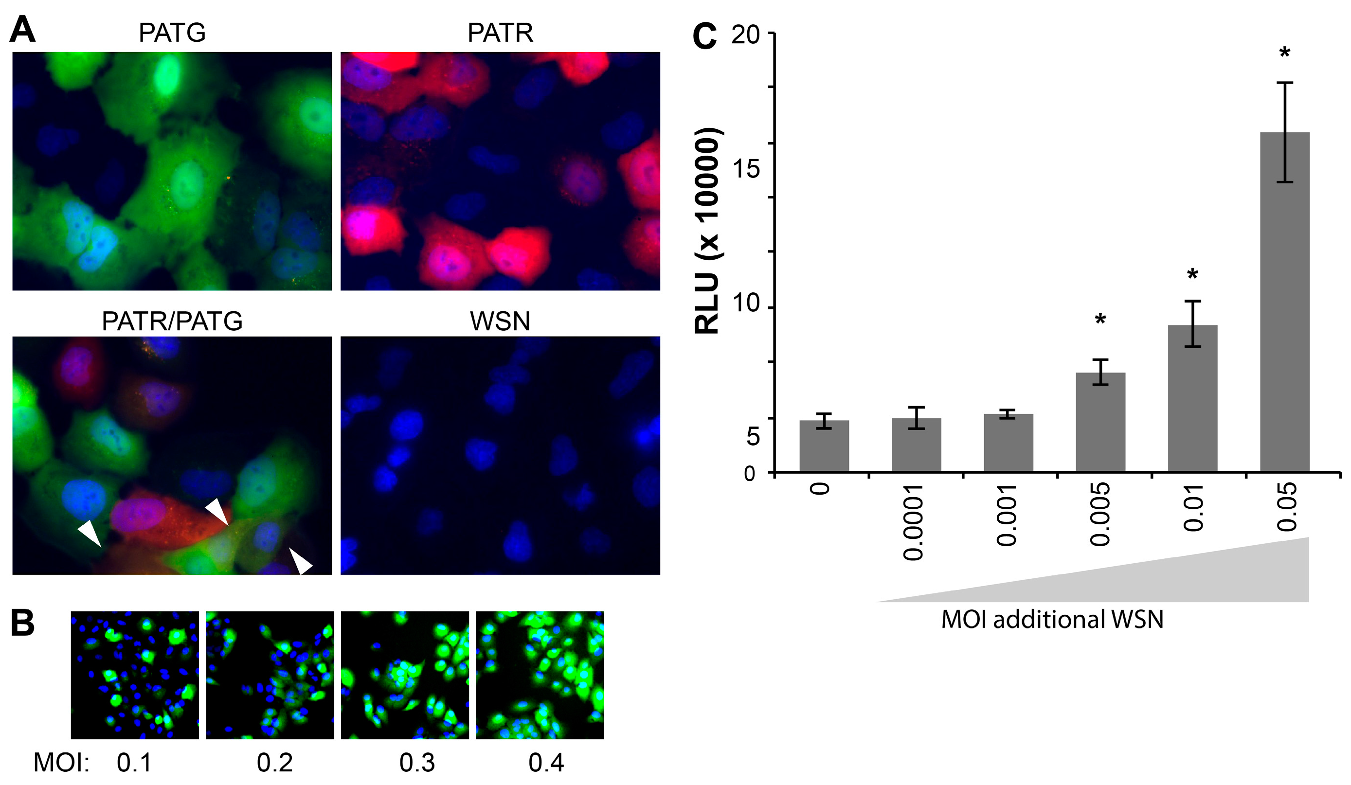 Following attachment and entry, fluorescent reporter viruses are especially useful in tracking gene expression at the cellular level without the administration of exogenous substrate for reporter activity. Live-cell microscopy detected robust fluorescence in A549 cells infected with PATG and PATR, but not WSN (Figure 3A). Singly infected and co-infected cells were simultaneously detected in cultures exposed to both PATG and PATR.