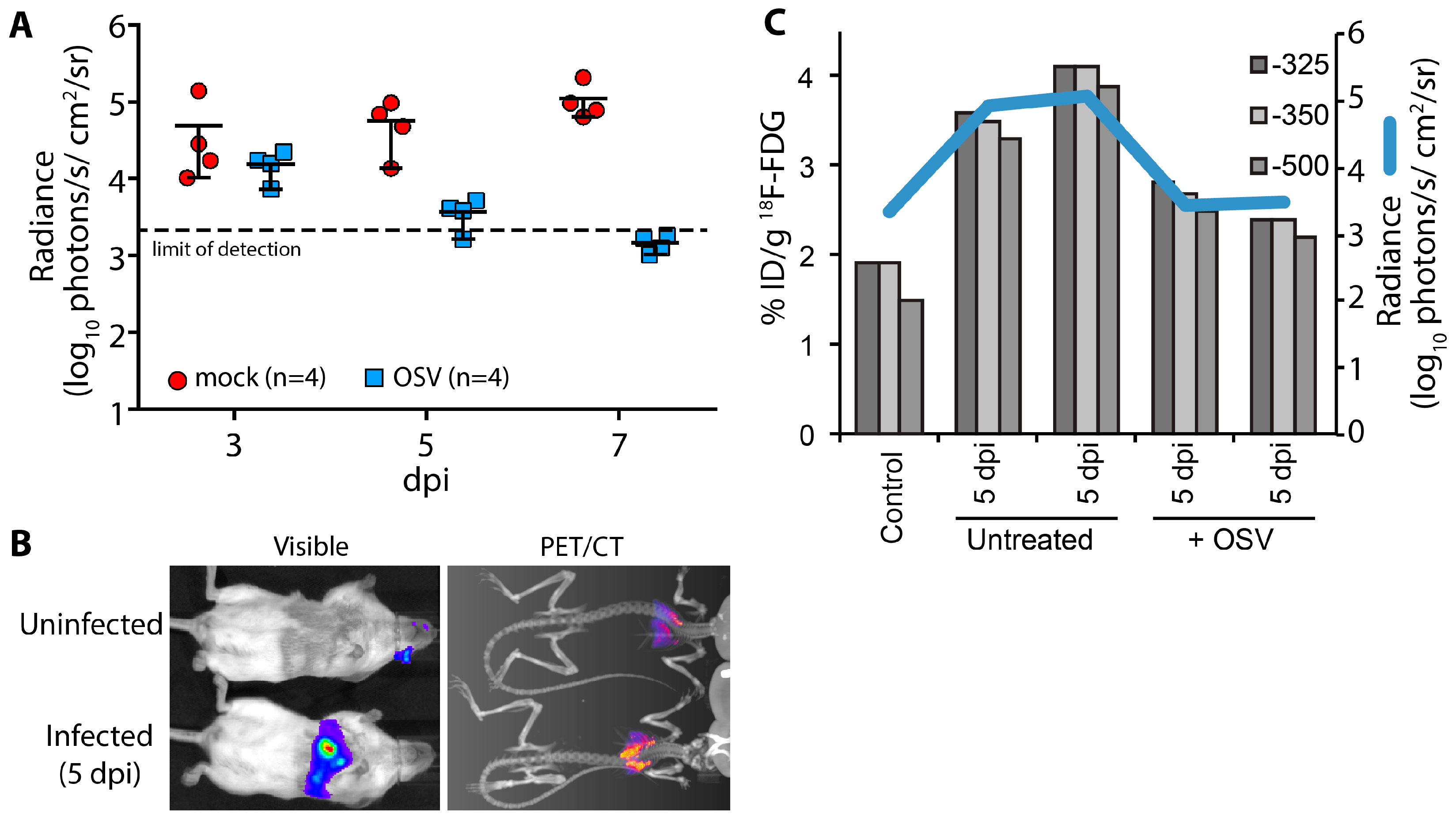 We then paired bioluminescence and PET/CT imaging to measure both virus replication and inflammation. Inflammation was measured in a subset of mice at 5 dpi using 18F-FDG, a radiotracer for detecting influenza-mediated inflammation [25] (Figure 4B). Lungs were segmented from computed tomography (CT) data using three Hounsfield unit thresholds to prevent artifacts due to changes in lung tissue density from edema and immune infiltrates. Inflammation was then measured from the positron emission tomography (PET) data by quantifying 18F-FDG localized to each of the CT-defined lung volumes (Figure 4C). OSV treatment dramatically reduced inflammation compared to mock-treated animals, approaching background levels detected in an uninfected control. Multi-modal imaging enabled measurement of both viral replication and host responses, and showed a remarkable correlation between viral load and inflammation in mice.