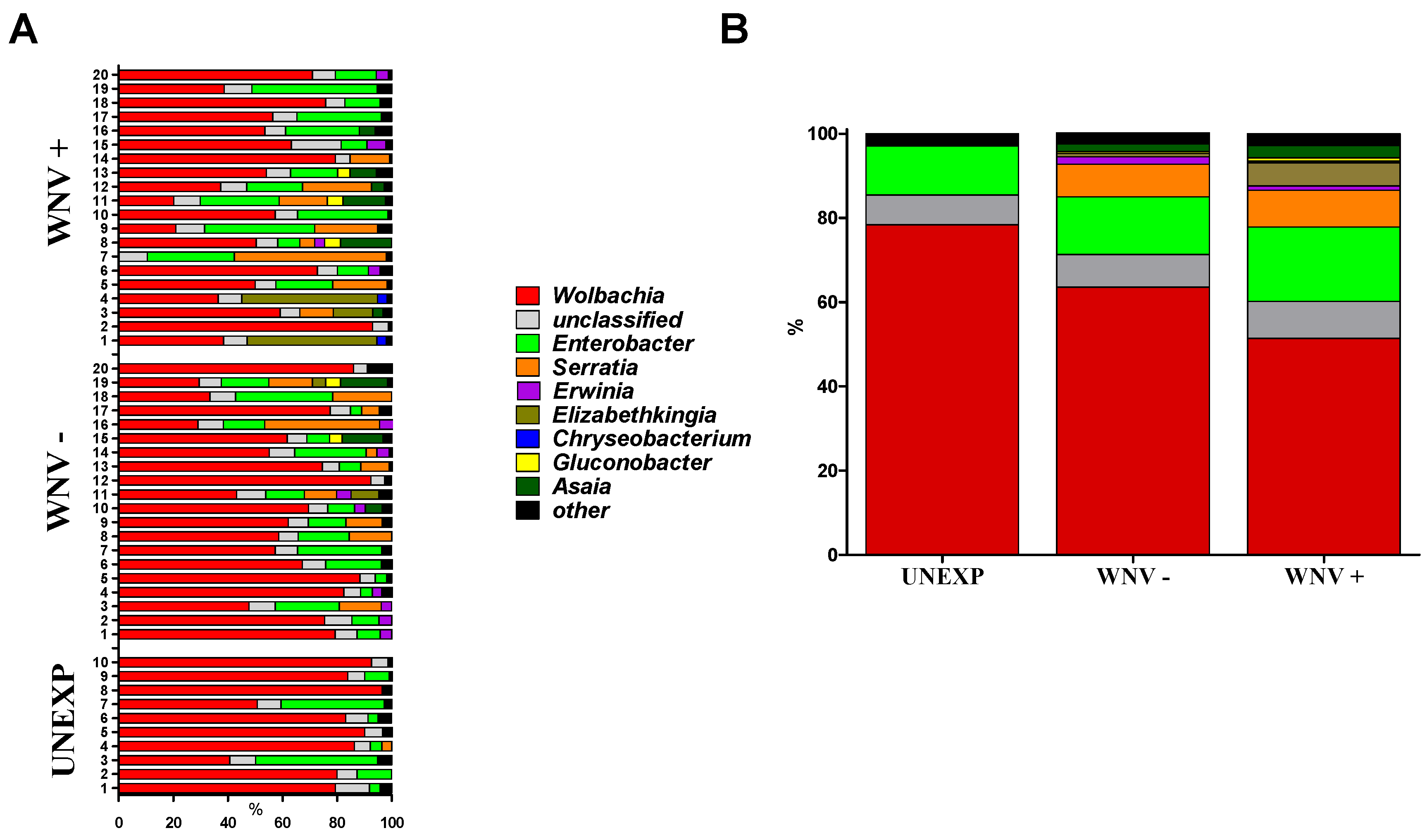 Proportions of bacterial genera identified in individual (A) or combined (B) Cx. pipiens at seven days post blood feeding. Mosquitoes are classified as unexposed (UNEXP, non-infectious blood meal), WNV negative (WNV−, WNV exposed but uninfected) or WNV positive (WNV+). Proportions were generated from 16S rRNA metagenomics workflow on MiSeq Reporter. “Other” refers to genera found at proportion below 3.5%.
