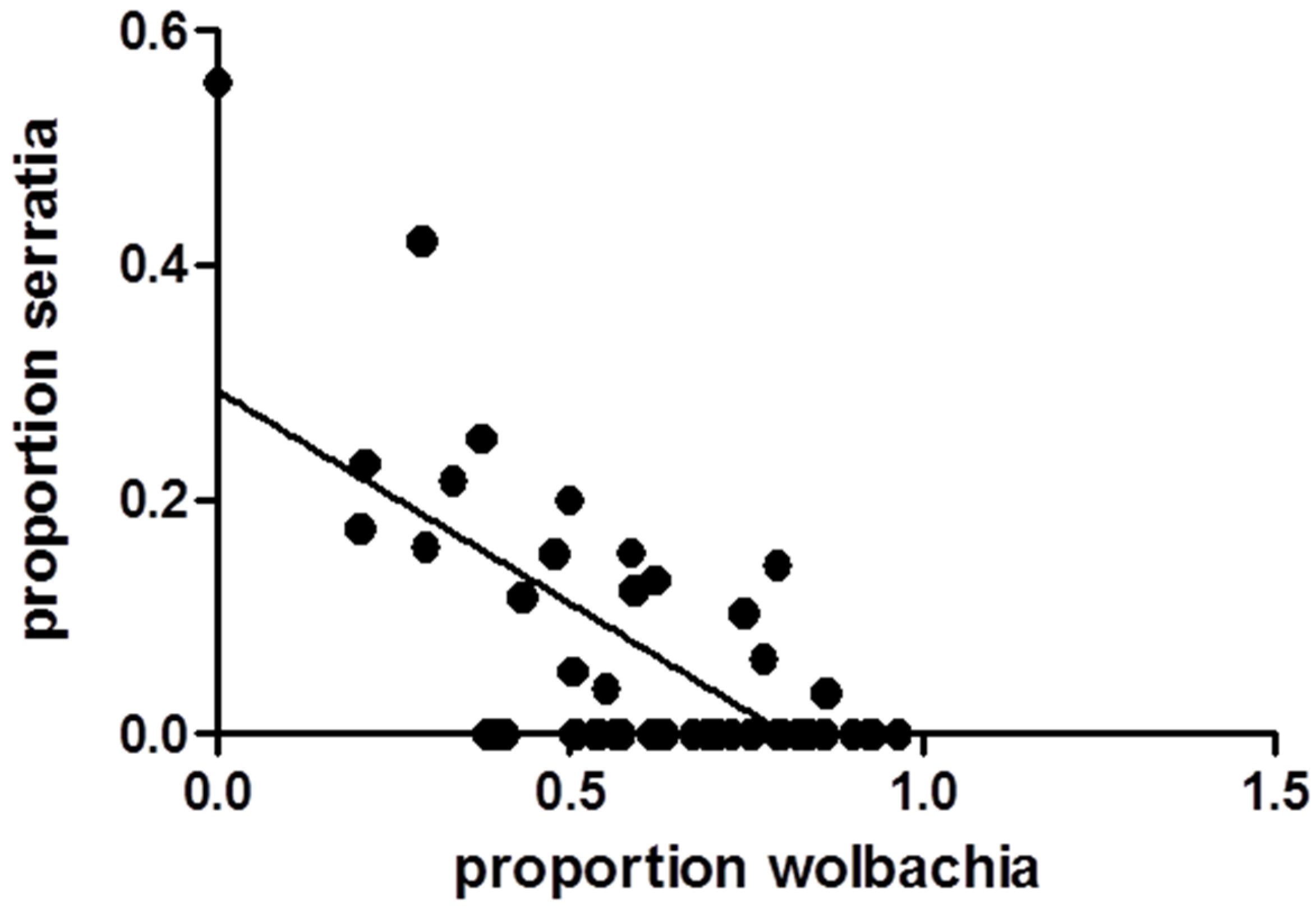 Relationship between the proportions of Wolbachia and Serratia in Cx. pipiens at seven days post blood feeding. Data points represent individual mosquitoes and the line represents the best-fit relationship resulting from linear regression analysis. A significant negative correlation was found (Pearson’s correlation, r = −0.687, p < 0.0001).