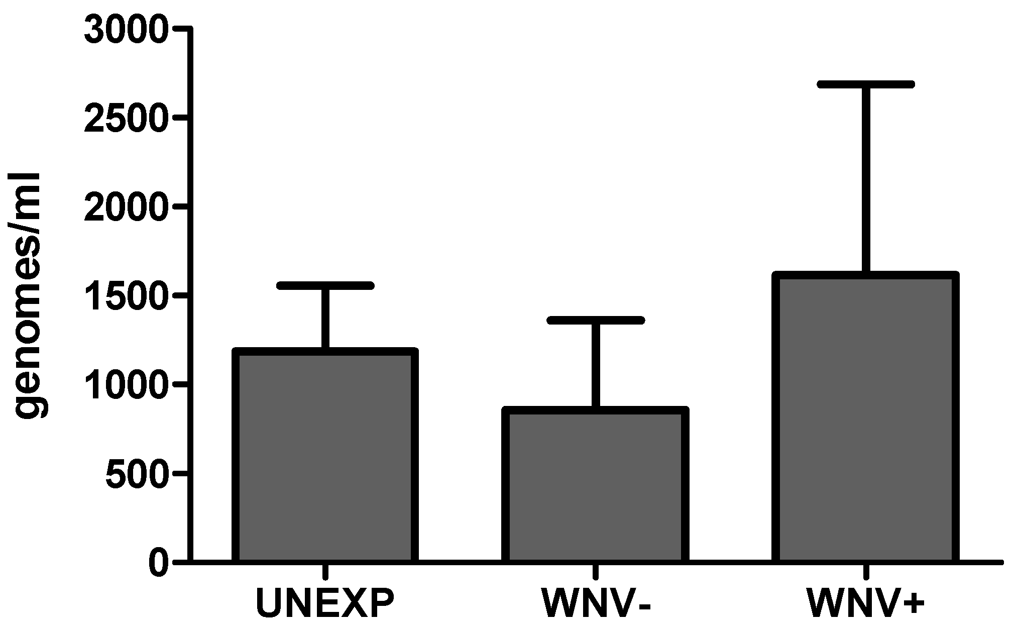 Total bacterial load in Cx. pipiens at seven days post blood feeding for unexposed (UNEXP), WNV−, and WNV+ mosquitoes. Bars represent means +/− SEM.