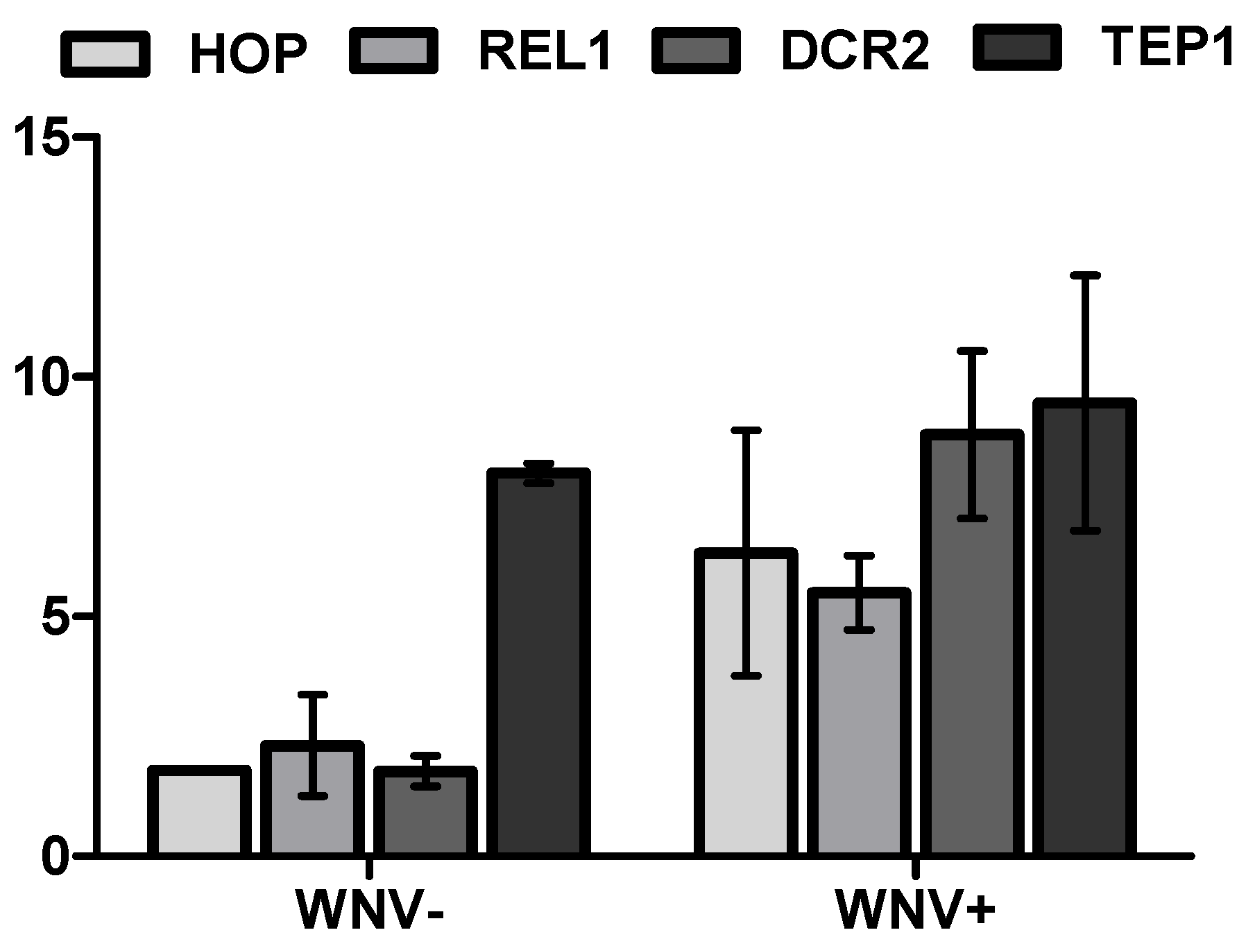 In order to assess if WNV exposure and infection, as well as unique microbial signatures, were associated with variability in the regulation of innate immune pathways, transcript levels of markers of individual pathways including Jak-STAT (HOP), Toll (REL1), and RNAi (DCR2), as well as TEP1, were quantified from Cx. pipiens pools after experimental treatments identical to those used to attain individual microbial signatures. Values for ΔΔCT, which control for small differences in the housekeeping gene and are expressed as relative differences as compared to the UNEXP group, demonstrate that all four markers are up-regulated at seven days post WNV exposure (Figure 4, t-test, p < 0.01). An approximately two-fold increase was measured for HOP, REL1, and DCR2, while a much larger eight-fold difference in TEP1 expression was identified. More substantial increases in levels of expression of all transcripts were measured in the WNV+ group, with approximately 5–10-fold increases measured relative to the UNEXP group. With the exception of TEP1, all values were also higher in the WNV+ group relative to the WNV− group, and the largest difference measured between these groups was for DCR2 expression. Together these data demonstrate that there is a generic up-regulation of the mosquito immune response which coincides with increases in bacterial diversity and is sustained following WNV exposure, even in the absence of established infection.