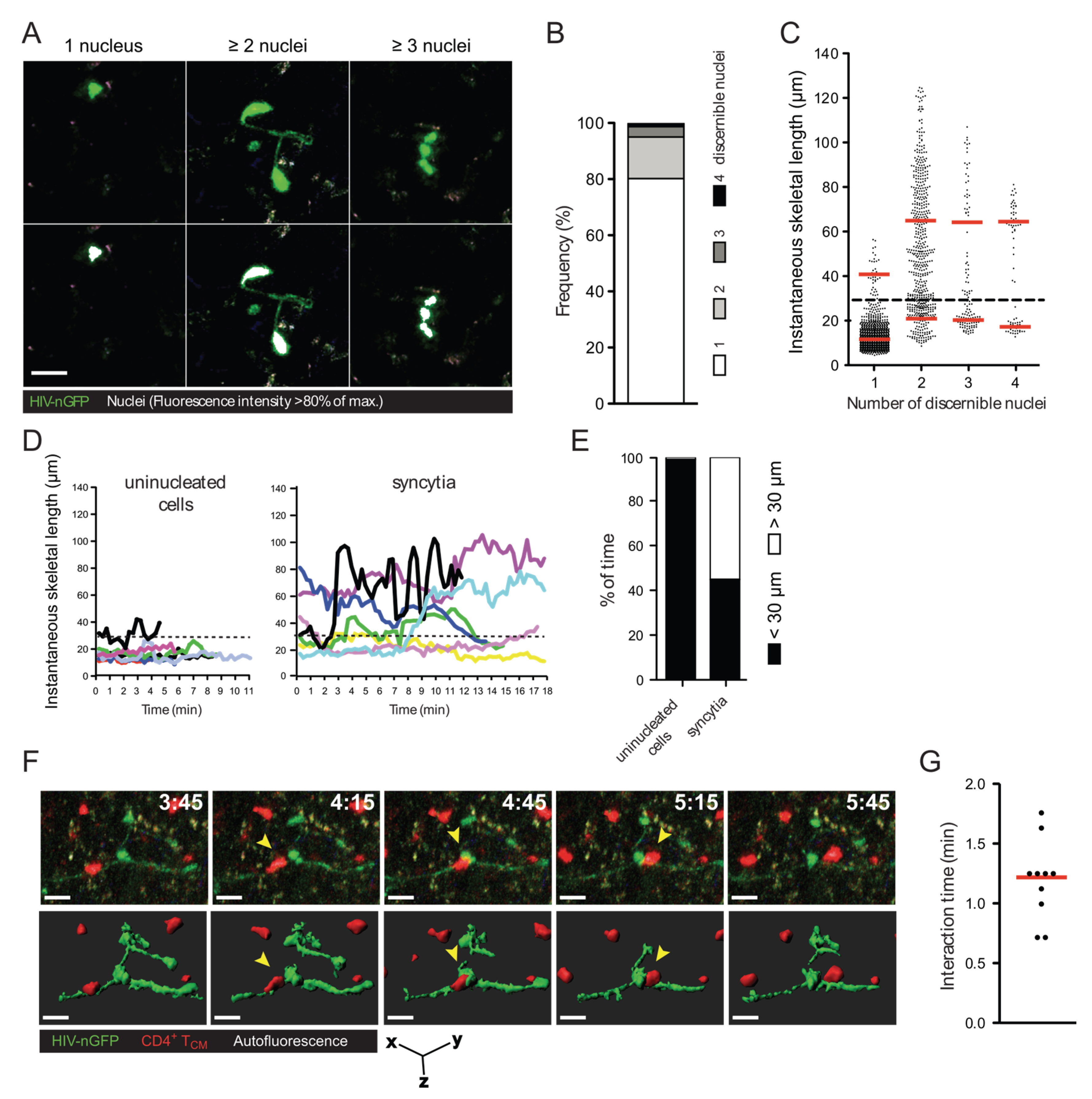 A considerable proportion of HIV-1-infected cells in the lymph node of humanized bone marrow/liver/thymus (BLT) mice exhibit elongated morphologies and reduced migration speed. Further, multiphoton intravital microscopy (MP-IVM) revealed that, surprisingly, a large fraction of these cells were syncytia [20]. To document this finding with more granularity, the number of discernible nuclei (revealed using an HIV-1 reporter strain that expresses EGFP fused to a nuclear localization signal, referred to as HIV-nGFP; see Figure 1A and [20]) and the instantaneous skeletal length of all infected cells in the lymph node were measured. As shown in Figure 1B, ~20% of infected cells are multinucleated with two, three, or four discernible nuclei (in decreasing frequency), and we did not observe any cells with five or more discernible nuclei during our imaging studies. However, it is possible that visualizing syncytia using HIV-nGFP may underestimate the number of nuclei in syncytia, since overlapping nuclei may appear as a single nucleus in some instances. Alternatively, larger syncytia may be more susceptible to apoptosis. Nevertheless, we conclude that HIV-1-induced syncytia are numerous in the lymph node, but remain small two days post-infection despite having demonstrated fusion competence. At a later time-point, large syncytia develop occasionally [23], though they likely involve non-lymphoid cells and thus may not be purely T cell-derived.