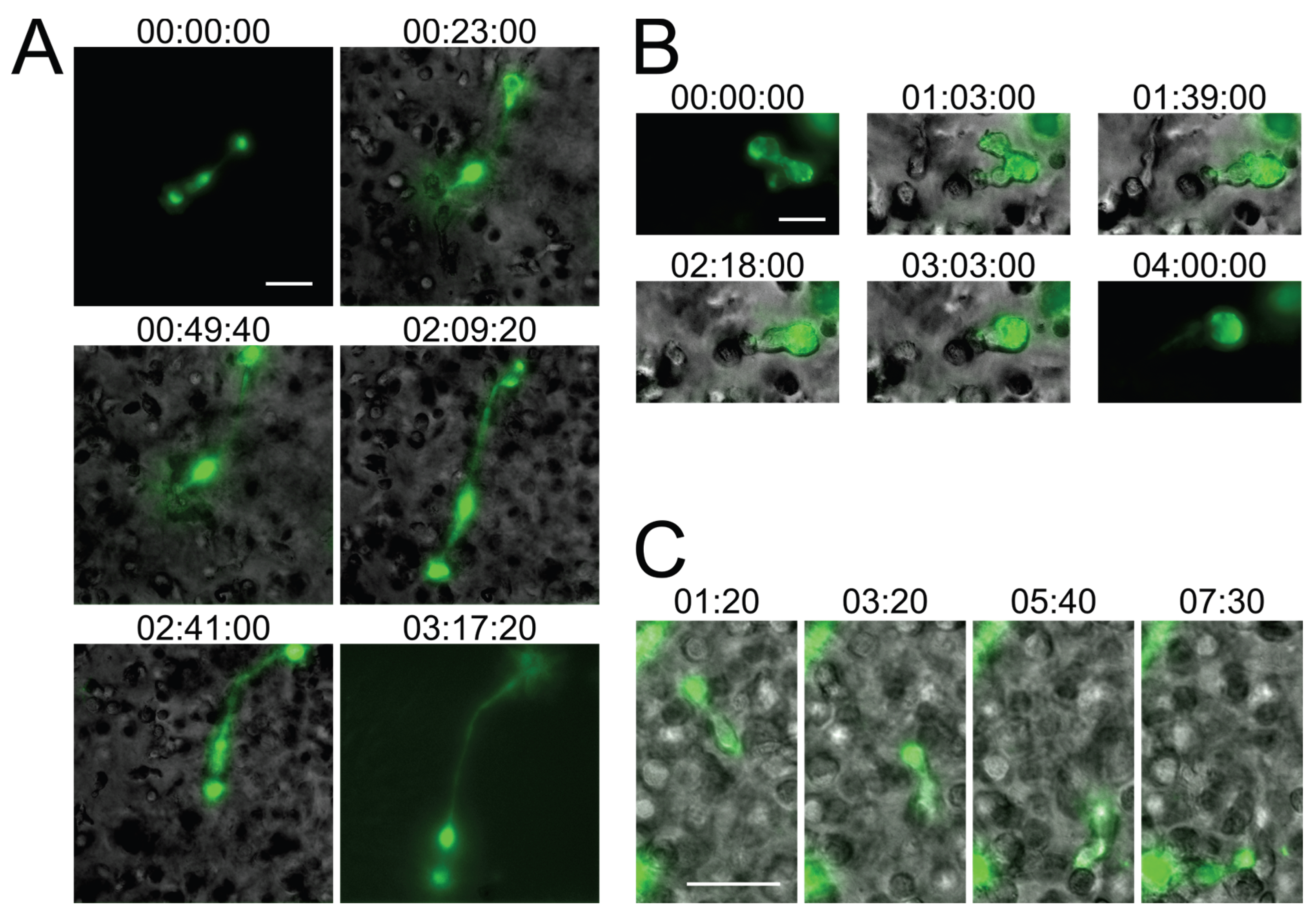 The medium covering the 3D ECM hydrogel was aspirated and replaced with prewarmed CO2-independent medium supplemented with 10% FBS. The glass-bottom dish was then placed on the microscope stage surrounded by a temperature-controlled enclosure preheated to 37 °C with a beaker of water for humidity. Fluorescence and brightfield images were acquired using 20× or 40× air objectives on a DeltaVision microscope (Applied Precision, Issaquah, WA, USA) on an Olympus IX70 base with a Xenon light source and automated Z-axis control, point visitation, and time-lapse acquisition. Using Fiji 2.0.0-rc-41 [52], Z-slices were projected (by maximum intensity for fluorescence images, and by minimum intensity for brightfield images), intensity levels were adjusted, and gamma correction was applied where indicated. Quantification of mean fluorescence intensity and skewness (Figure 3B,C) was performed using Fiji 2.0.0-rc-41 [52] by manually circling each cell at each time point as a region of interest, which was then exported using the Analyze/Measure tool. Any frames where a cell of interest was obscured by another cell were omitted from the analyses. Note that the times shown in Figure 3 do not necessarily correspond to the times in Movies S6 and S7, due to the realignment of the traces as described in the legend for Figure 3, though the same realignment was used for Figure 3B,C. The in vitro data shown in Figure 2, Figure 3 and Figure 4 were taken from six 18–24 h imaging sessions and a total of 55 imaging fields.