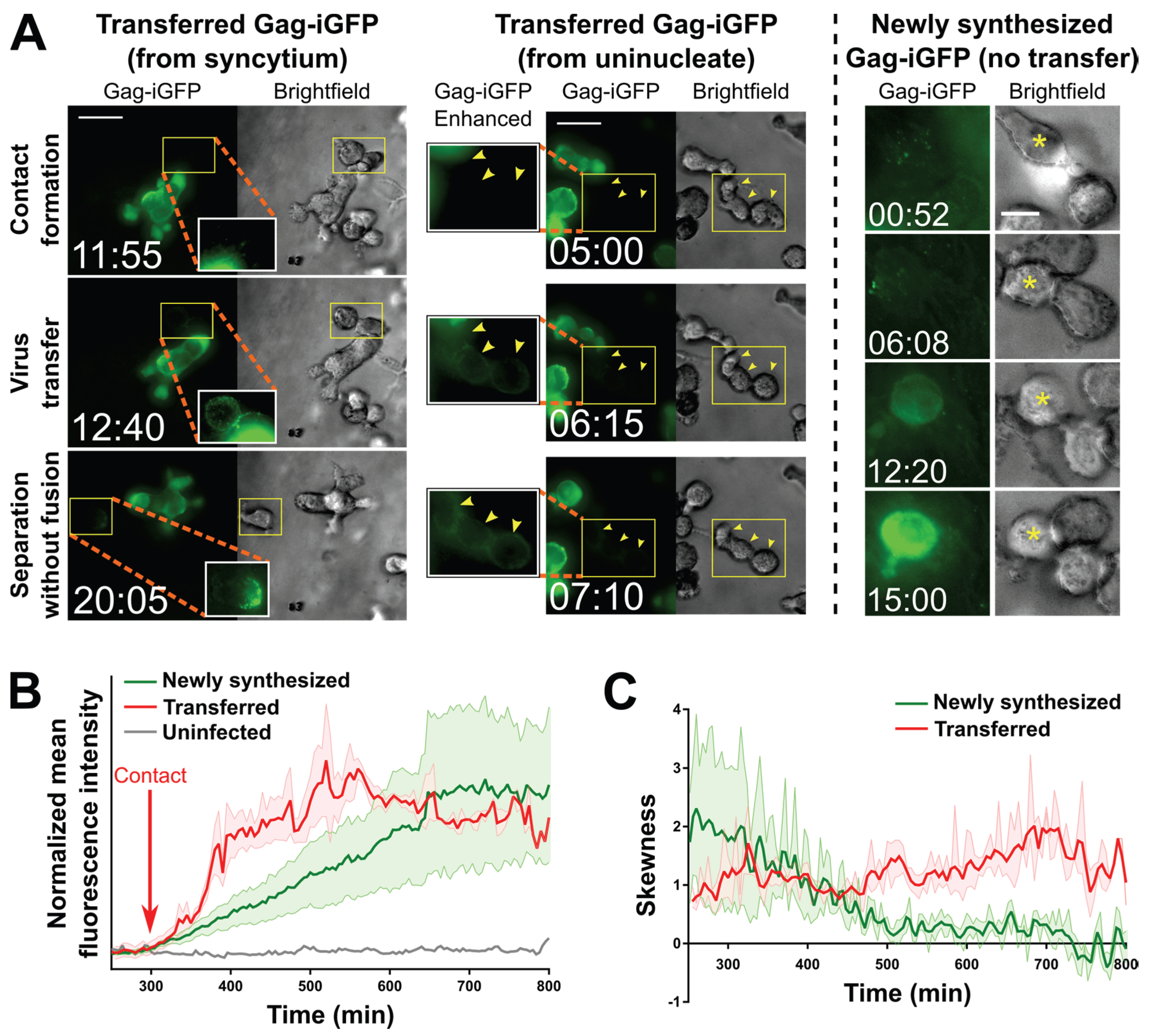 Transfer of virus particles from HIV-1 NL4-3Gag-iGFP-infected uninucleated CEM-SS cells and CEM-SS syncytia to uninfected CEM-SS cells in 3D ECM hydrogels. (A) (Left); A syncytium with 3 nuclei transfers virus to target cells, one of which then migrates away (see also Movie S7). (Middle); A uninucleated infected cell transfers virus to three target cells (yellow arrowheads; see also Movie S6). (Right): An uninfected cell with Gag-iGFP puncta on its surface (asterisk) begins developing newly synthesized Gag-iGFP signal ~12 h later, while a cell it is attached to throughout this time that did not harbor Gag-iGFP puncta is not seen to develop Gag-iGFP signal. Scale bars = 30 μm ((left) and (middle)) or 10 μm (right). Elapsed time in hours:minutes. Gag-iGFP signal is pseudocolored in green. Brightfield images are in shades of gray. To show transferred virus particles more clearly, the areas indicated by yellow boxes are shown in white-boxed enhanced insets with 1.5× enlargement and a 0.6 gamma correction applied; (B) Average of the mean fluorescence intensities of five target cells exhibiting either transferred Gag-iGFP (red), or five other target cells developing newly synthesized Gag-iGFP from a previously unseen infection event (green). An uninfected cell is shown in grey. The individual traces were aligned according to the time where Gag-iGFP signal began increasing (which was the time of contact with the producer cell in all cases for the transfer traces; red arrow), and the averaged curves were manually normalized to baseline and smoothed (2nd order and 2 nearest neighbors); (C) The average skewness of the signal across these same cells was plotted. Skewness close to zero indicates evenly distributed, or hazy signal, while higher positive skewness indicates punctate signal. Error boundaries in (B,C) represent the standard error of the mean.