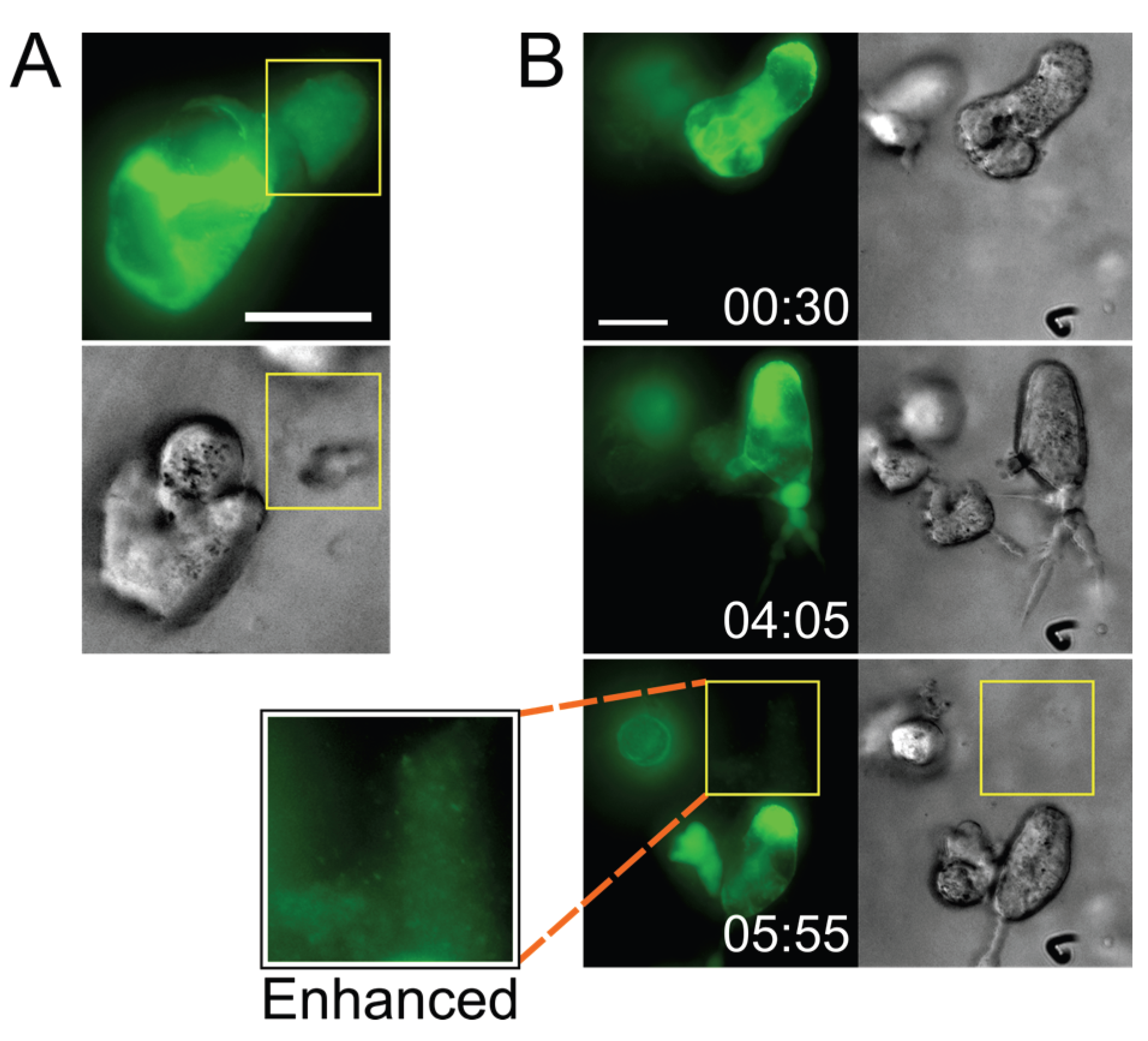 Infected cells deposit virus particles into pools within their surrounding stroma. (A) A CEM-SS syncytium in Matrigel culture releases a very dense accumulation of Gag-iGFP puncta into a cell-free pocket (area bounded by yellow box; still from Movie S7); (B) A CEM-SS syncytium in Matrigel culture migrates across the field, leaving behind a trail of dense Gag-iGFP puncta (area bounded by yellow box), shown also at 2× magnification and with brightness enhanced in a white-boxed inset (see also Movie S9). Scale bars = 20 μm. Elapsed time in h:min. Gag-iGFP signal is pseudocolored in green. Brightfield images are in shades of gray.