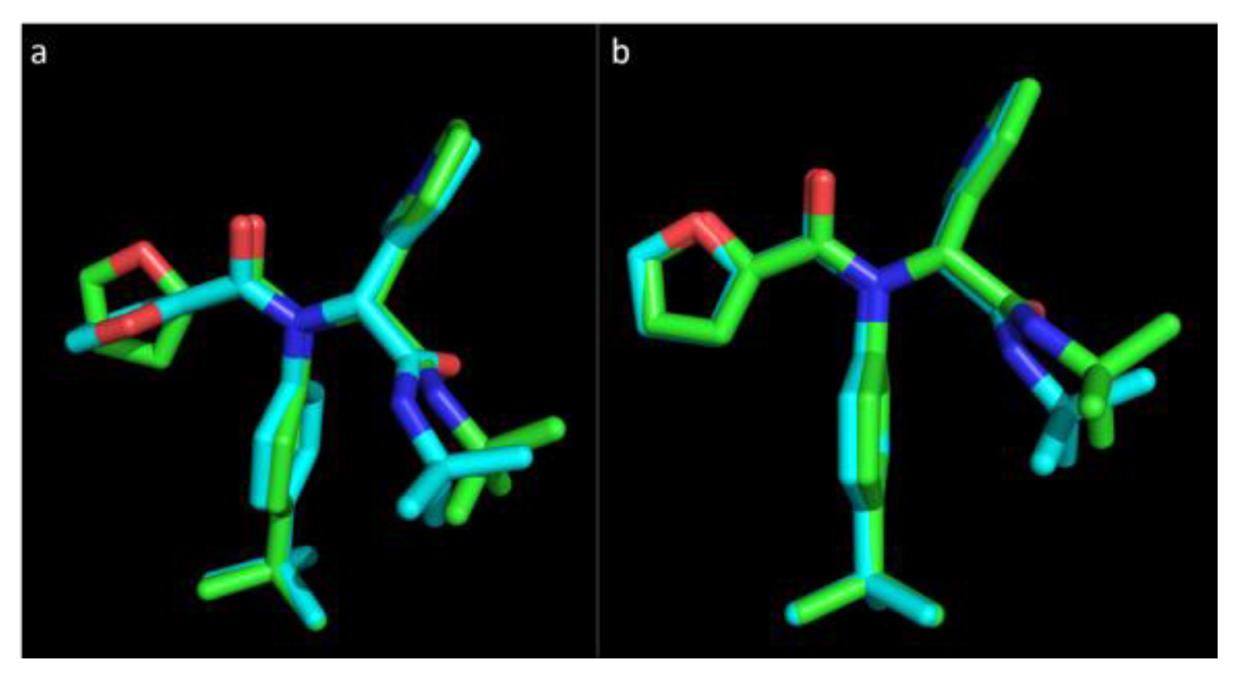 Molecular docking algorithms are often calibrated on a training set of experimental ligand-protein complexes and accuracy of these docking programs is often highly dependent on the training set used [52]. This highlights the importance of confirming that the docking software used for virtual screening is capable of replicating the binding mode of a known, experimental inhibitor for the class of enzymes studied [53,54].