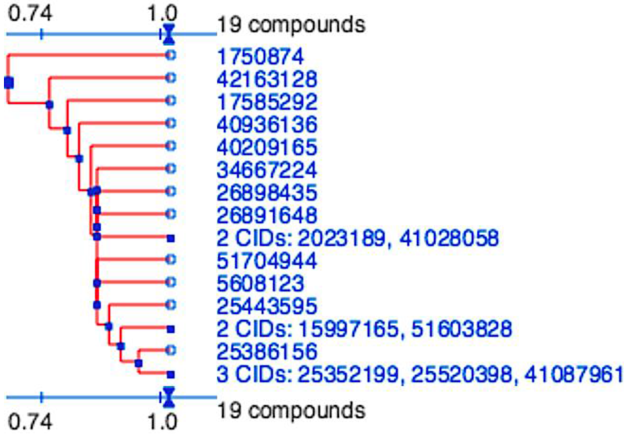 Division of the nineteen candidate ligands into fifteen distinct 3D clusters, as determined by the PubChem (https://pubchem.ncbi.nlm.nih.gov) structure-clustering web-service. 3D Tanimoto similarity scores were calculated from alignments generated using shape + feature and ten conformers per ligand. The dendogram was generated using similarity score of 1.04, which is recommended to achieve statistical significance at the 95% confidence interval.
