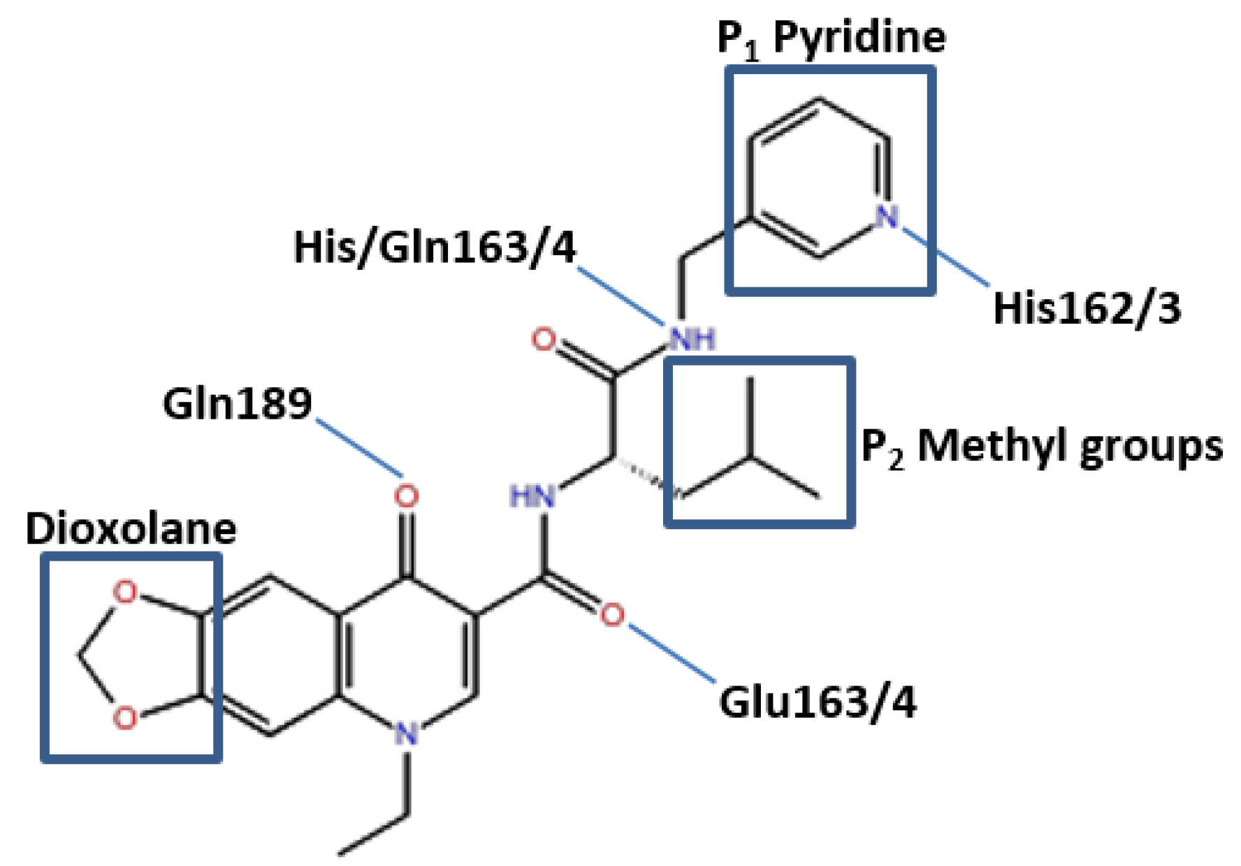 Pose of the ZINC09411012 ligand within the active site of the 3CLpro. Representation of elements mediating hydrogen bonds with respective residues and the P1 pyridine, hydrophobic P2 and solvent exposed dioxolane.