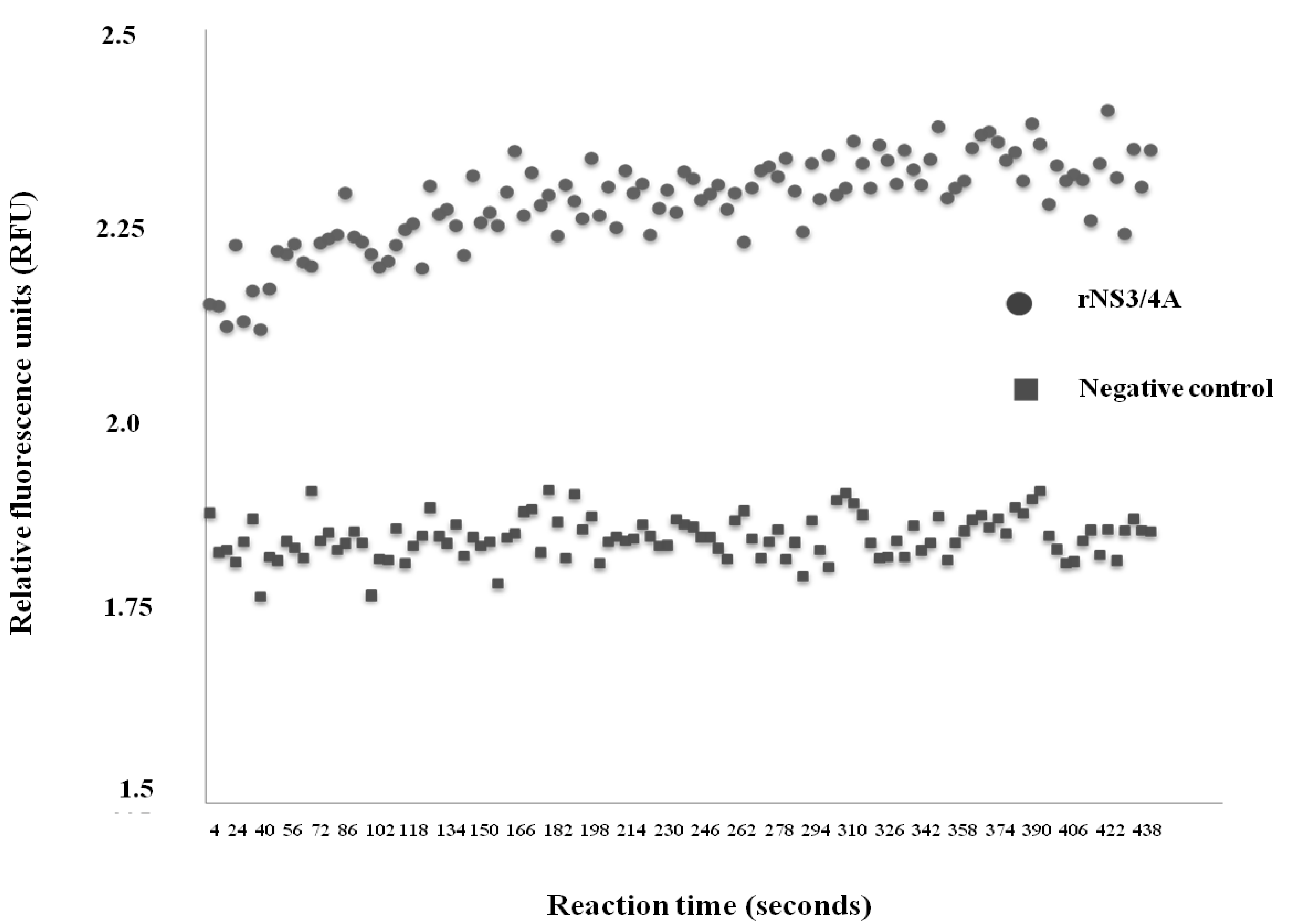 Protease activity of the recombinant rNS3/4A protein as determined by fluorescence resonance energy transfer (FRET) assay. The rNS3/4A cleaved the fluorogenic substrate, DE-D(EDANS)-EE-Abu-ψ-[COO]-AS-K-( DABCYL), and released the fluorescent signals from the separated substrate peptides, shown as relative fluorescence units (RFU) per second.