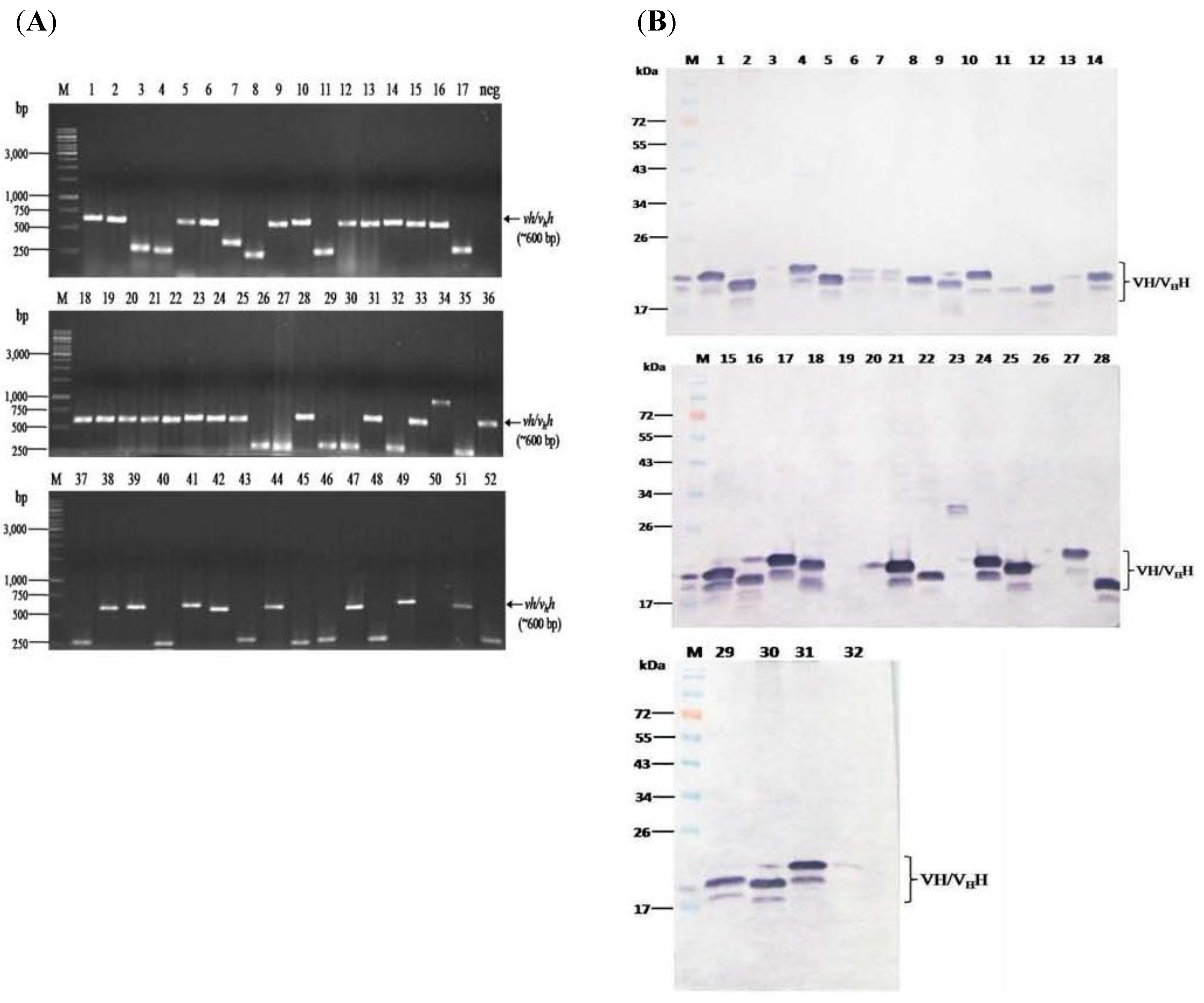 Amplicons of humanized-vhs/vhhs in the HB2151 E. coli clones transfected with the NS3/4A-bound phages and the VHs/VHHs contained in the E. coli lysates revealed by Western blot analysis. (A) Results of PCR amplification of vhs/vhhs using 52 randomly picked phage transformed HB2151 E. coli colonies as templates and R1 and R2 primers. The expected size of vh/vhh sequences including flanking region of phagemid was ~600 bp (arrows). Lane M of all three blocks, GeneRulerTM 1 kb DNA ladder; lanes 1, 2, 5, 6, 9, 10, 12–16, 18–25, 28, 31, 33, 36, 38, 39, 41, 42, 44, 47, 49 and 51 were 32 E. coli clones that were positive for the vh/vhh amplicons; lane neg, negative control (PCR mixture without DNA template). Numbers at the left of all blocks are DNA sizes in base pairs (bp); (B) Western blot results for detecting the VHs/VHHs in lysates of the 32 E. coli clones that carried the vhs/vhhs. Lane M, Pre-stained standard protein ladder; lanes 1–2, 4–18, 21–22, 24–25 and 27–32 show VHs/VHHs (~19–22 kDa) expressed from 28 clones; lane 3, 19, 23 and 26 were lysates of vh/vhh-positive E. coli clones that did not express VHs/VHHs. Numbers at the left of all blocks are protein molecular sizes in kDa.