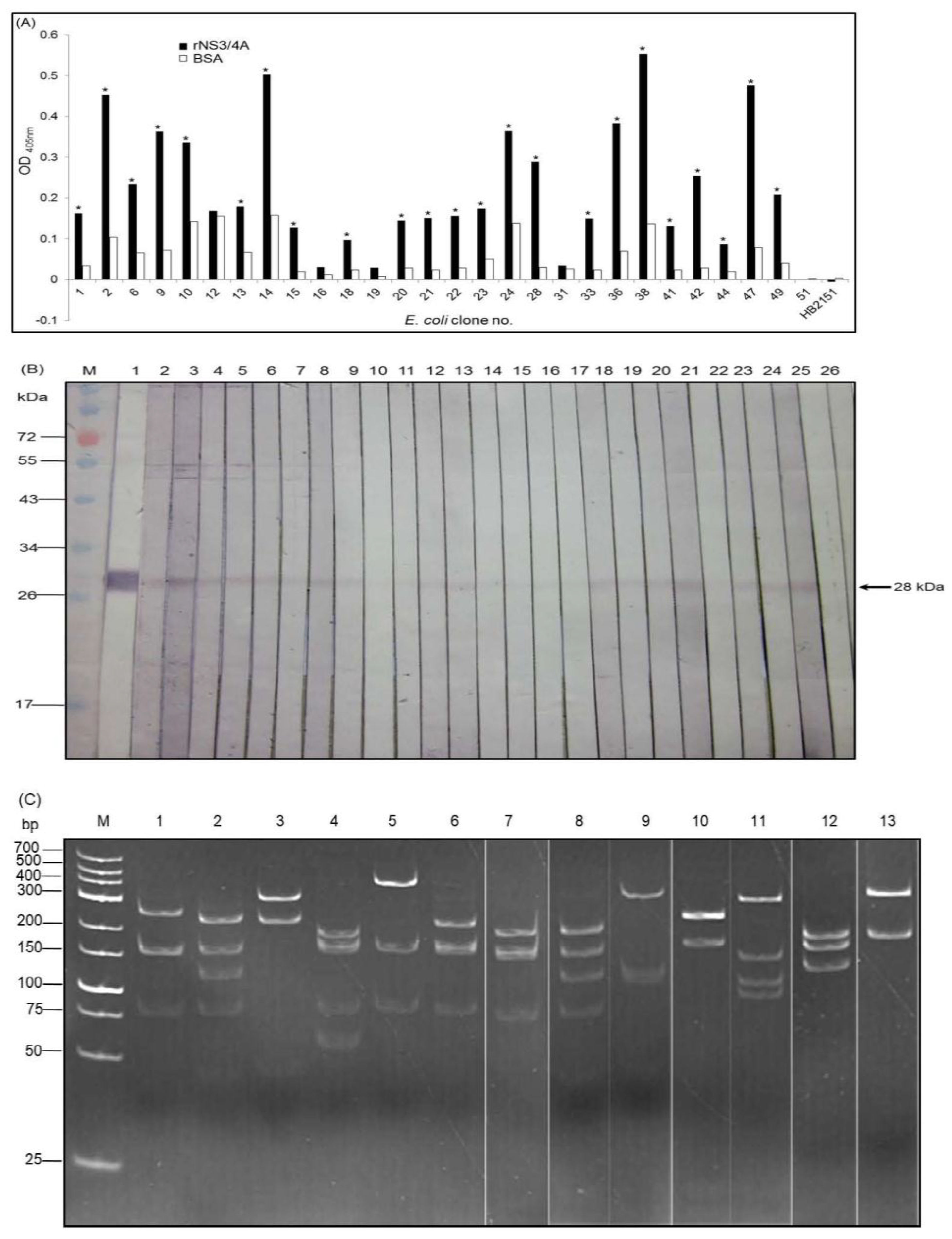 Binding of the VHs/VHHs expressed from the 28 vh/vhh-positive E. coli clones to the rNS3/4A and restriction fragment length polymorphism (RFLP) of the vhs/vhhs of the antigen specific nanobodies. (A) Indirect ELISA results. Nanobodies from 23 of the 28 E. coli clones gave significant OD405nm ELISA signal to the rNS3/4A above the control antigen (BSA). They were clone nos. 1, 2, 6, 9, 10, 13–15, 18, 20–24, 28, 33, 36, 38, 41, 42, 44, 47 and 49. Normal E. coli lysate (HB2151) was used as the background control; (B) Western blotting results. The VHs/VHHs of the 23 clones also bound specifically the SDS-PAGE separated-rNS3/4A(lanes 2–24). Lane M, Protein molecular mass marker. Lane 1, SDS-PAGE separated-rNS3/4A probed with mouse anti-6× His tag which served as positive control; (C) DNA banding patterns (RFLP) of vhs/vhhs from the 23 E. coli clones which revealed 13 different patterns. Lane 1, pattern 1 (clone no. 1); lane 2, pattern 2 of clone nos. 2, 14, 22 and 44; lane 3, pattern 3 of clone nos. 6, 21 and 36; lane 4, pattern 4 of clone no. 9; lane 5, pattern 5 of clone nos. 10, 28 and 49; lane 6, pattern 6 of clone nos. 13 and 47; lane 7, pattern 7 of clone no. 15; lanes 8–13, pattern 8–13 of clone nos. 18, 20, 24, 28, 33 and 41, respectively. Lane M, GeneRulerTM 1 kb DNA ladder.