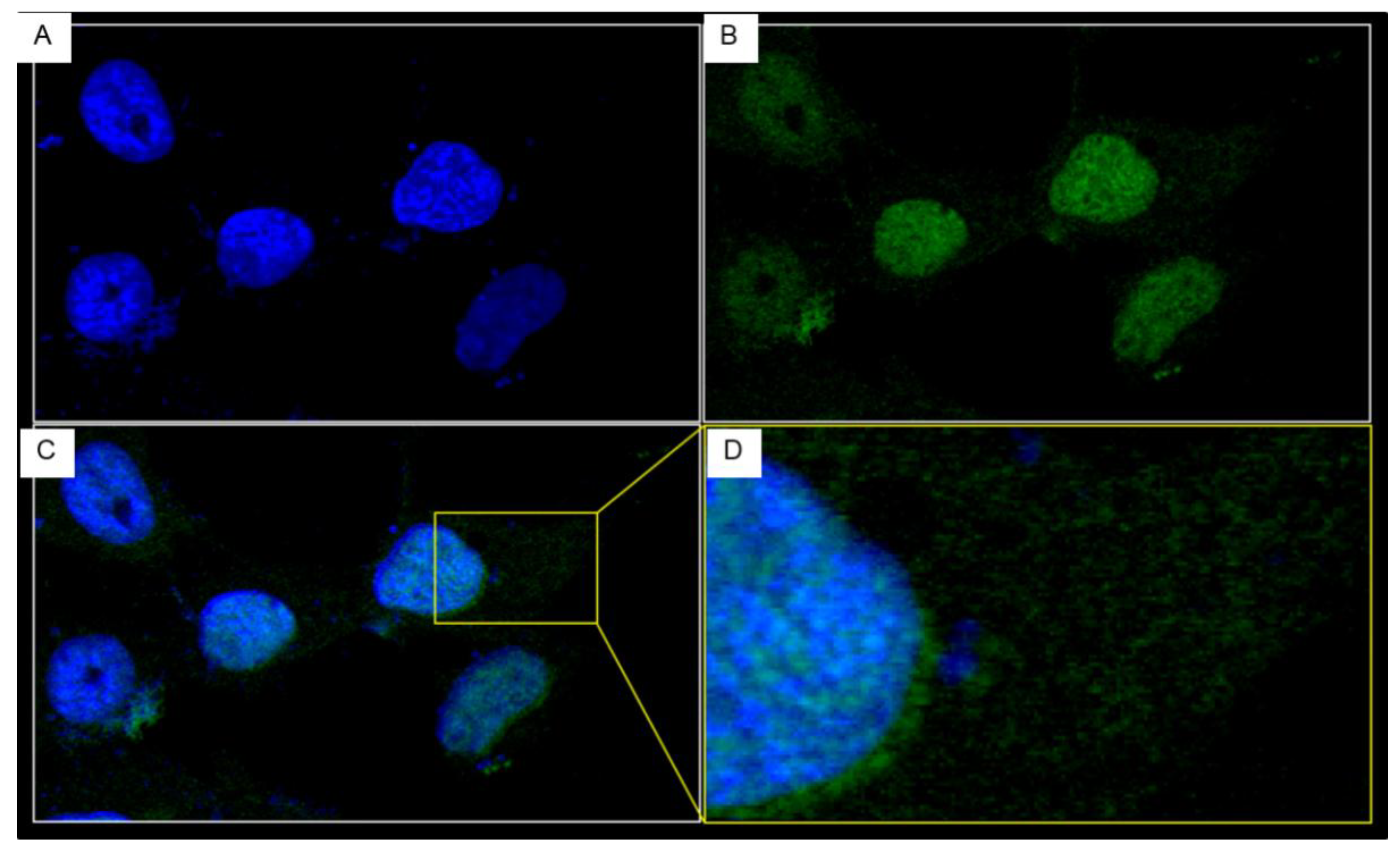 Intracellular localization of the PEN-VHH24 revealed by confocal microscopy. Huh7 cells treated with 10 μg of PEN-VHH24 for 24 h were washed, fixed with cold methanol, permeated with 1% Triton X-100 before adding with mouse anti-6× His Tag and donkey anti-mouse immunoglobulin (DyLight_488), respectively. (A) DAPI was used to stain the cell nuclei (blue); (B) The penetratin linked-nanobodies appear in green in the cells; (C) Merged A and B; (D) Enlarged square area of (C) showing localization of the PEN-VHH24 in both nucleus and cytoplasm.