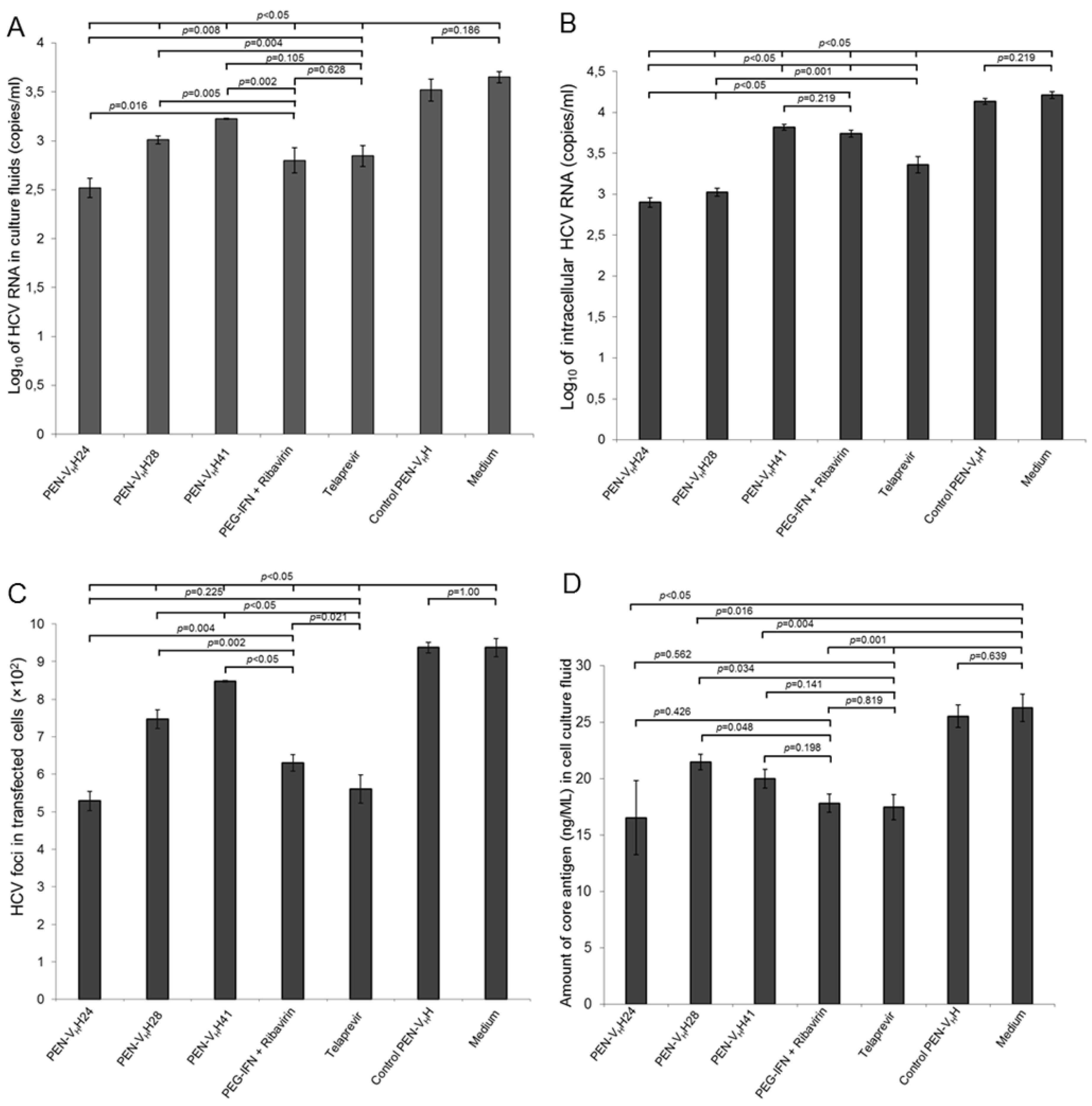 The JFH-1 RNA transfected-Huh7 cells cultured in the medium containing 25 µg of PEN-VHH24, PEN-VHH28, PEN-VHH41, 100 units of PEG-IFN-α + 50 nM ribavirin, and 0.175 μM telaprevir had significantly less HCV 5’ UTR RNA in the culture supernatants (Figure 6A) and inside the cells (Figure 6B) than the transfected cells cultured in the medium alone (negative inhibition control) and the cells treated with control PEN-VHH (background inhibition control) (p < 0.05). Efficacy of the PEN-VHH24 was slightly higher than the PEG-IFN-α + ribavirin and telaprevir.