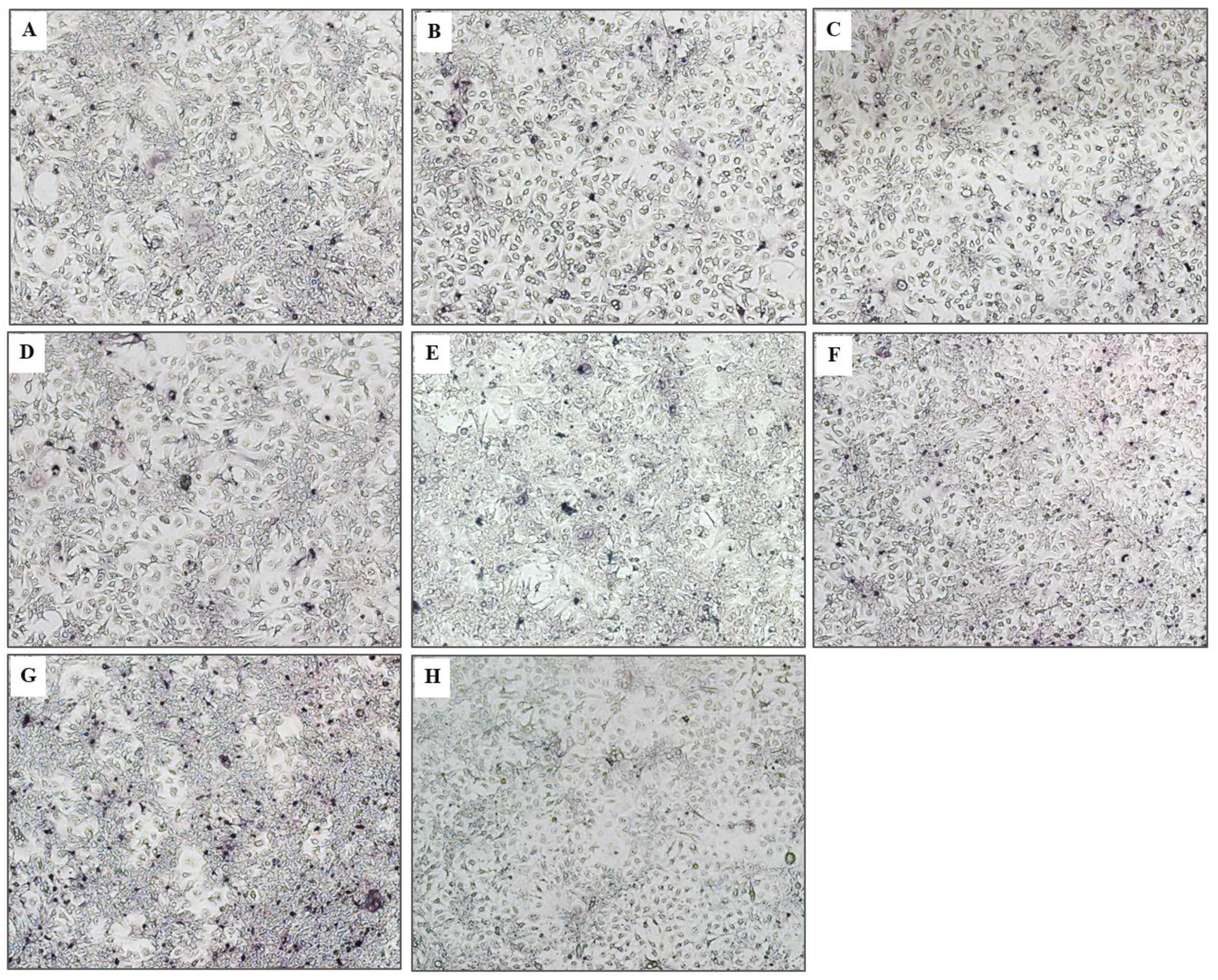 HCV foci in Huh 7 cells treated with cell penetrable VHHs and controls. Core antigen in the foci was detected by mouse anti-HCV core antibody, goat anti-mouse immunoglobulin-AP conjugate and substrate. (A)–(E) The numbers of foci in the transfected cell treated with PEN-VHH24, PEN-VHH28, PEN-VHH41, PEG-IFN-α + ribavirin and telaprevir, respectively, which were significantly less than the transfected cells treated with control PEN-VHH (F) and medium alone (G). (H) Non-infected Huh7 cells.