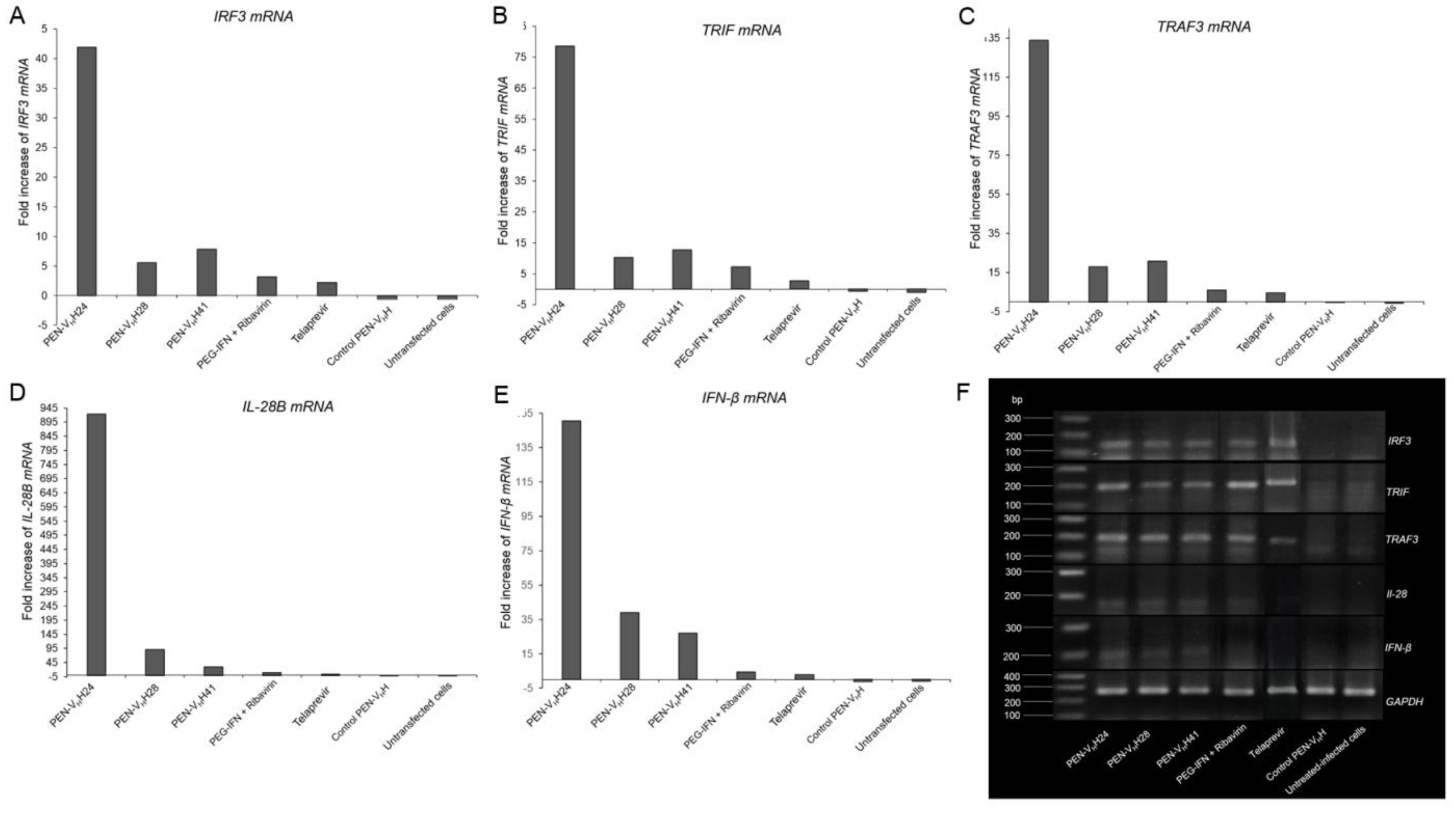 Fold increase of the mRNA expressions of the innate immune response genes, i.e., IRF3, TRIF, TRAF3, IL-28B and IFN-β, of the JFH-1 RNA transfected Huh7 cells after treating with the protease specific-transbodies, control PEN-VHH, PEG-IFN-α + ribavirin, telaprevir and untreated transfected cells as determined by qRT-PCR are shown in Table 1 and Figure 8A–E, respectively. There were significant increases of the mRNAs of all studied innate immune response genes in the transfected cells treated with the PEN-VHH24, PEN-VHH28 and PEN-VHH41, PEG-IFN-α + ribavirin and telaprevir compared with the transfected cells without any treatment, treated with control transbody or the untransfected cells (p < 0.05). Results of agarose gel electrophoresis of the qRT-PCR amplicons of the innate immune response genes of all treatments are shown in Figure 8F using the GAPDH gene for normalization.