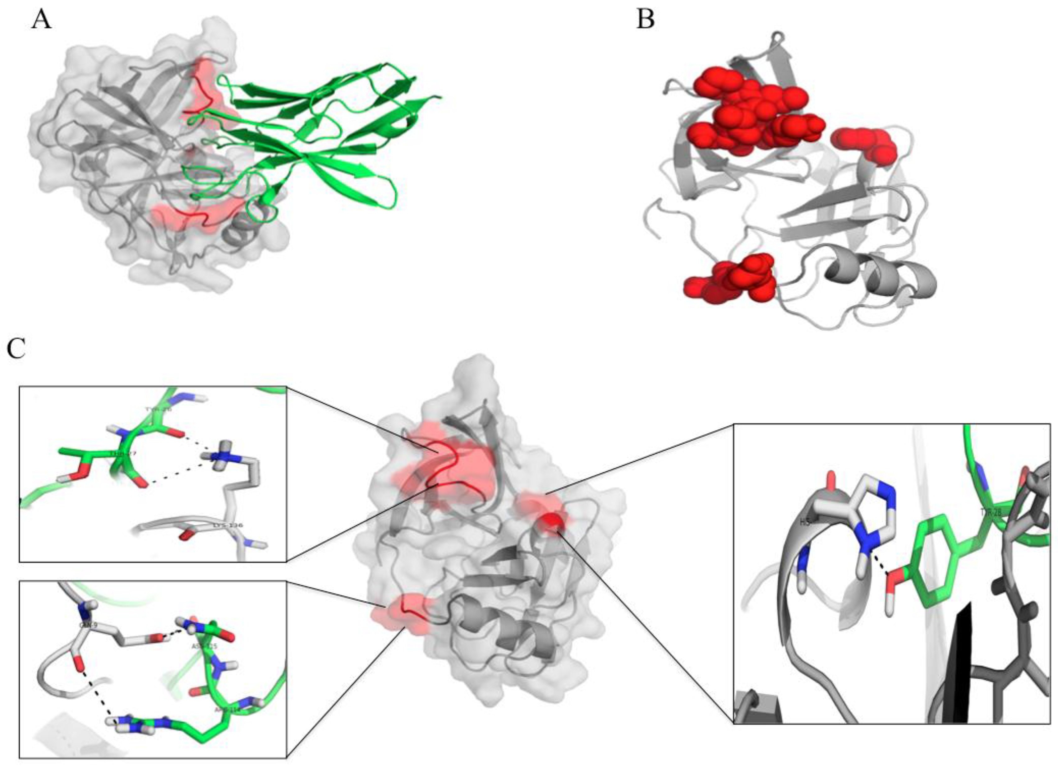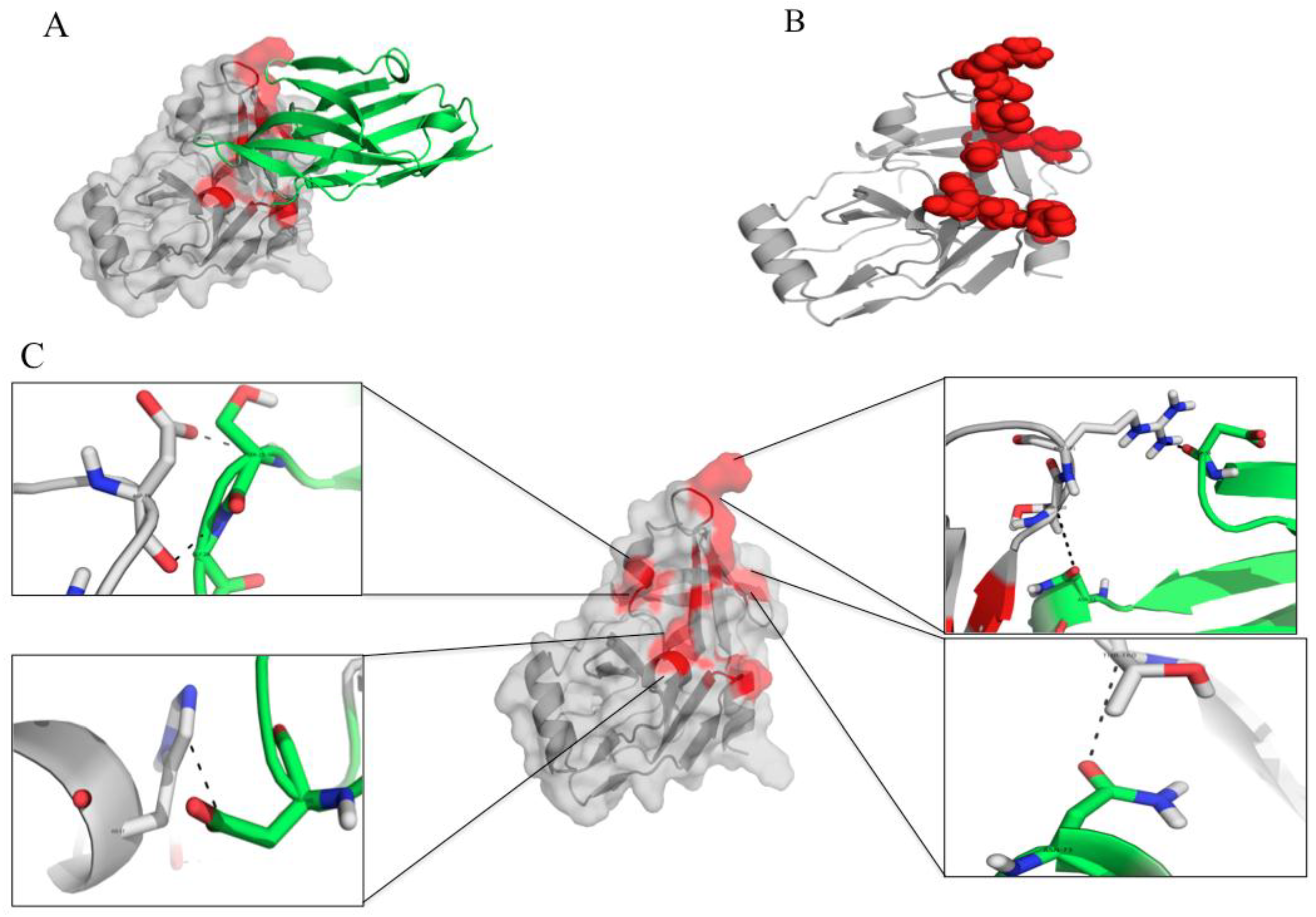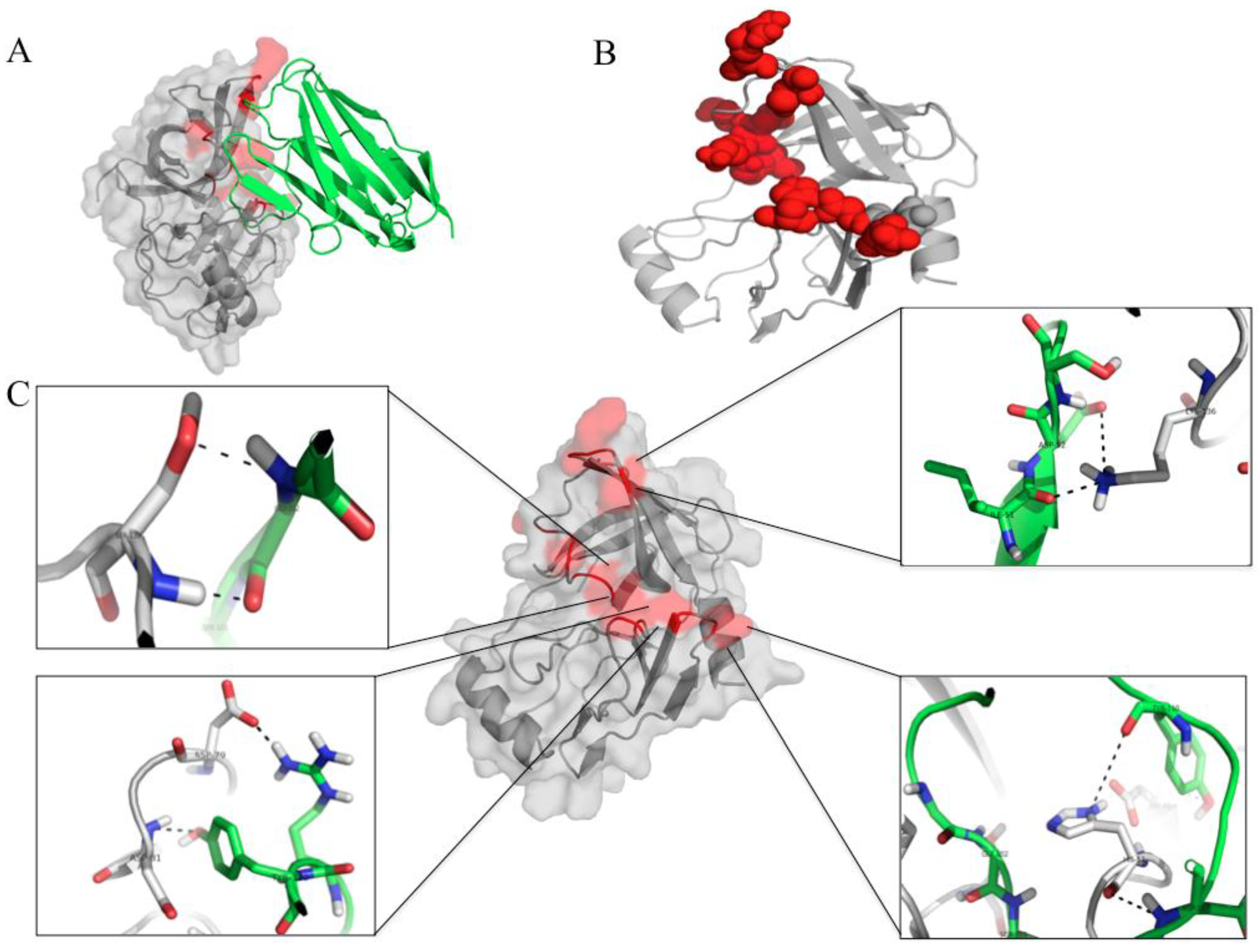 The interactive residues between the HCV NS3/4A protease and the protease specific-VHH41. (A) and (B) The nanobody (green in A) uses CDRs 1 and 3 and FRs 1, 3 and 4 to bind to juxtaposed areas of the folded protease molecule (red); (C) Details of the interactive residues between the nanobody (green) and the target (grey) (see also Table 1C).